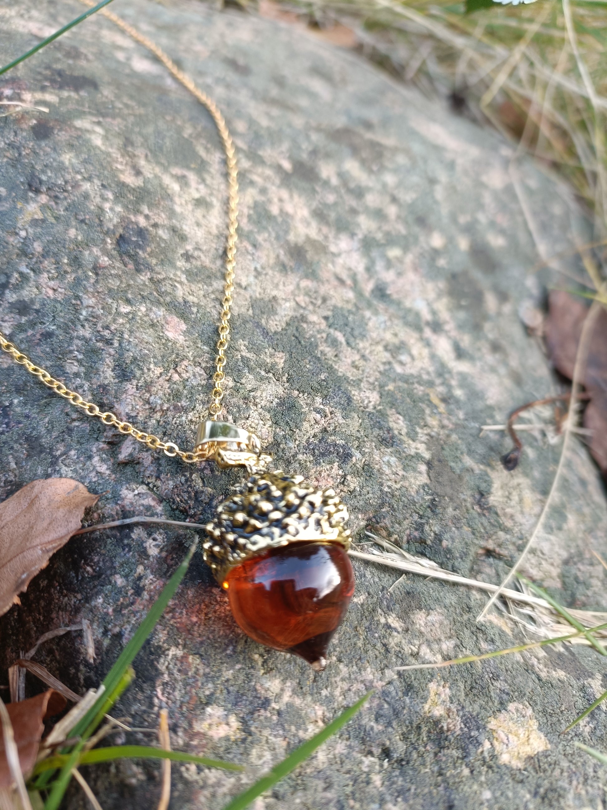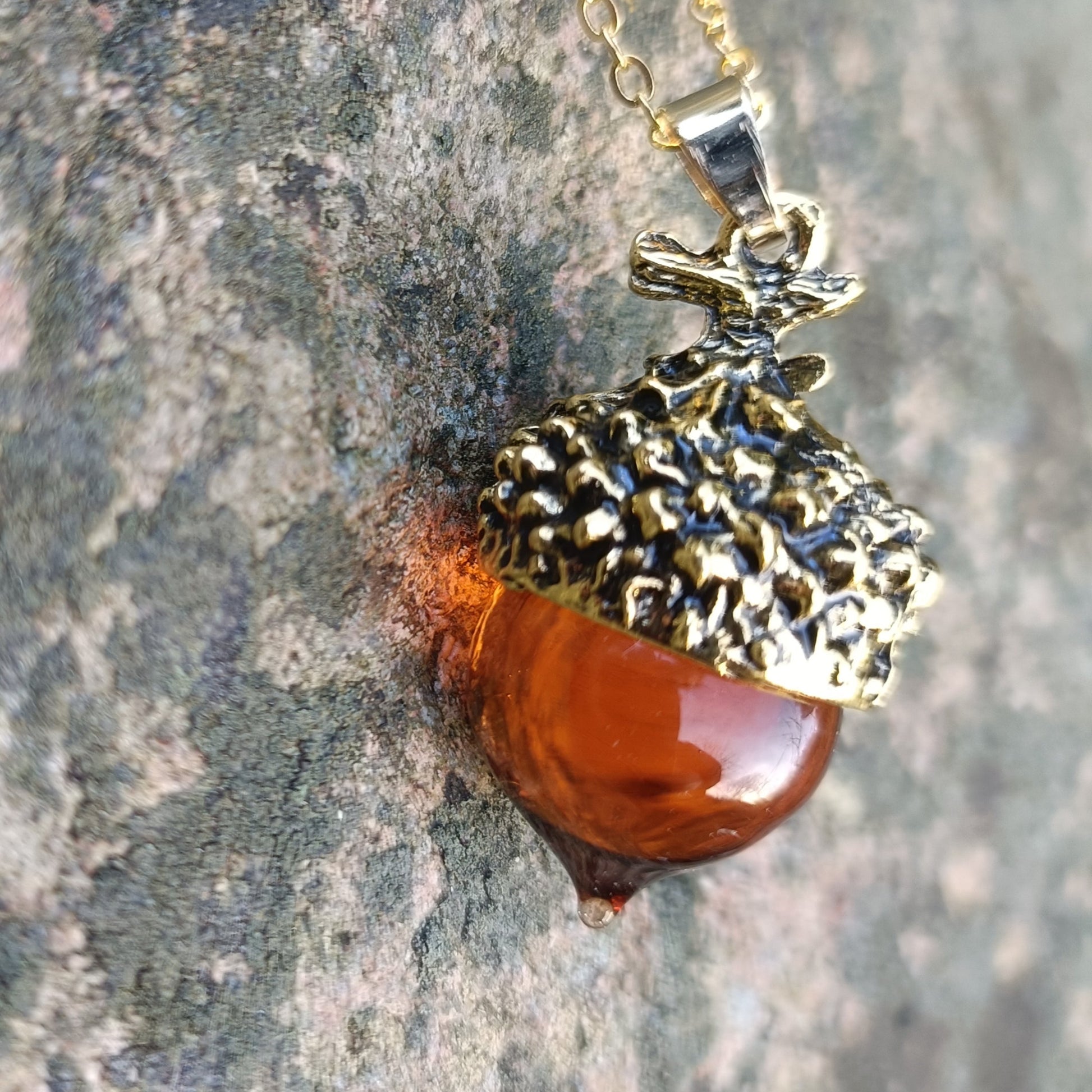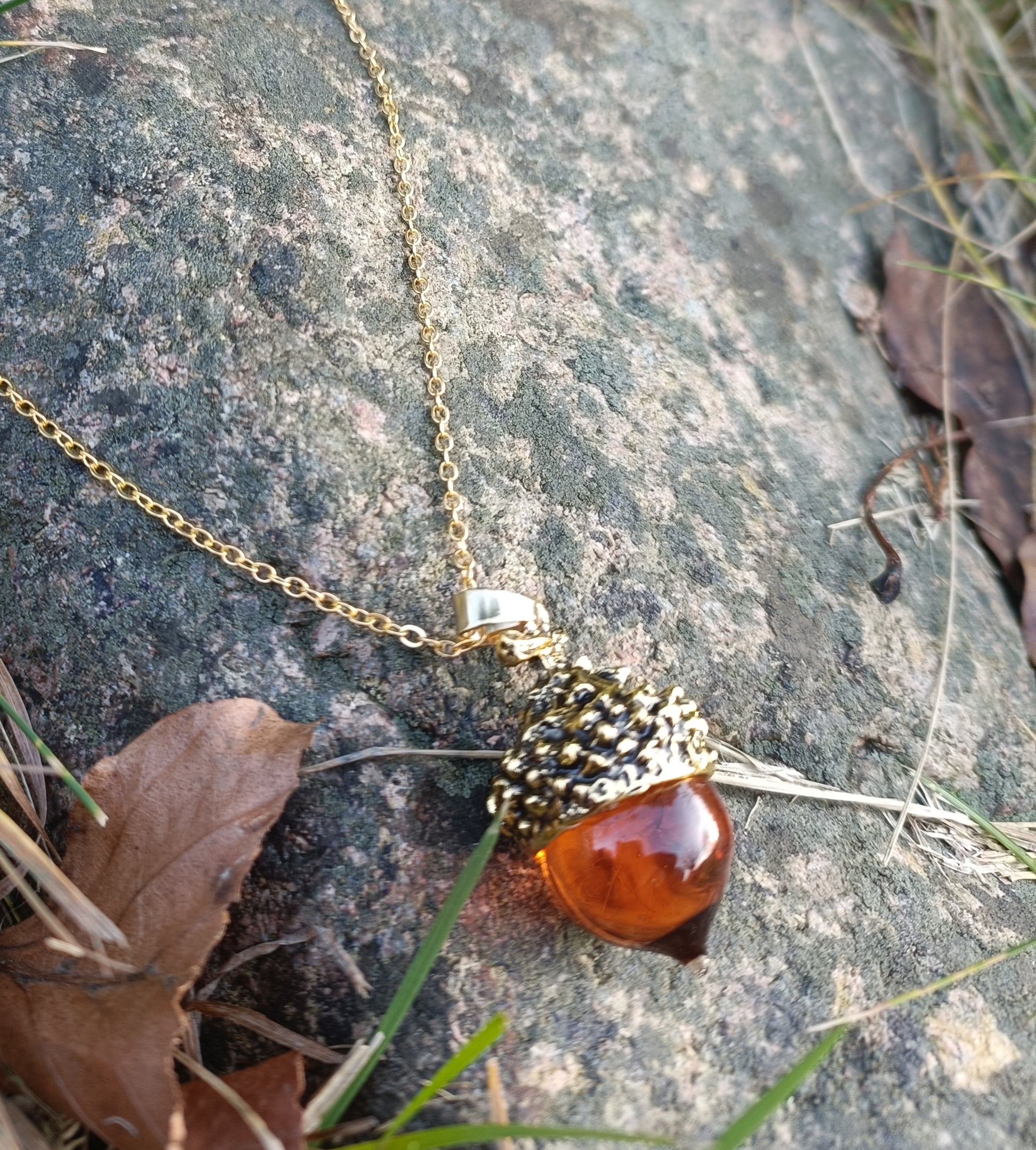 Celebrate the beauty of nature with this enchanting Acorn Necklace, handcrafted with a glass acorn pendant and an alloy chain. This unique piece is perfect for nature lovers and those who adore woodland-inspired jewelry.