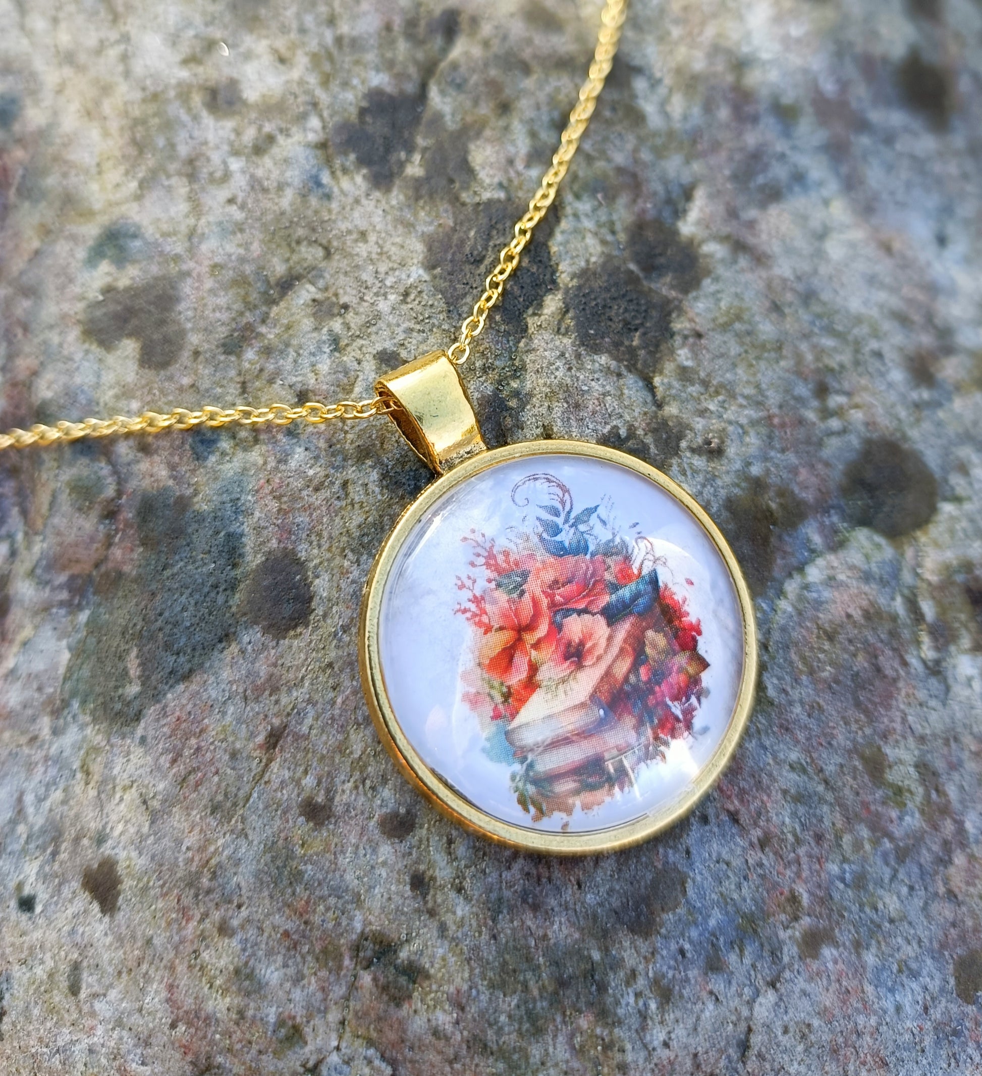 Embrace the beauty of literature and nature with this Bookquet Necklace, featuring an elegant book and floral motif set on a gold-colored steel cabochon. A perfect piece for book lovers, writers, and romantics, blending the charm of storytelling with the grace of blooming flowers.