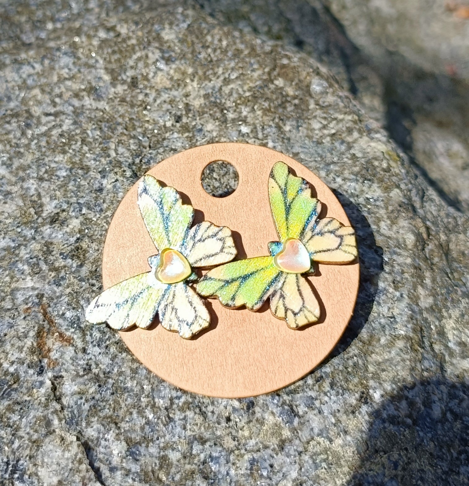Delicate and full of charm, these butterfly stud earrings are crafted from a lightweight wooden base, hand-painted with care, and sealed with a shimmer varnish for a soft, iridescent finish. A small acrylic ornament adds depth and detail, giving each piece a playful yet elegant look. Mounted on hypoallergenic steel studs, they’re perfect for everyday wear or as a whimsical touch to any outfit.