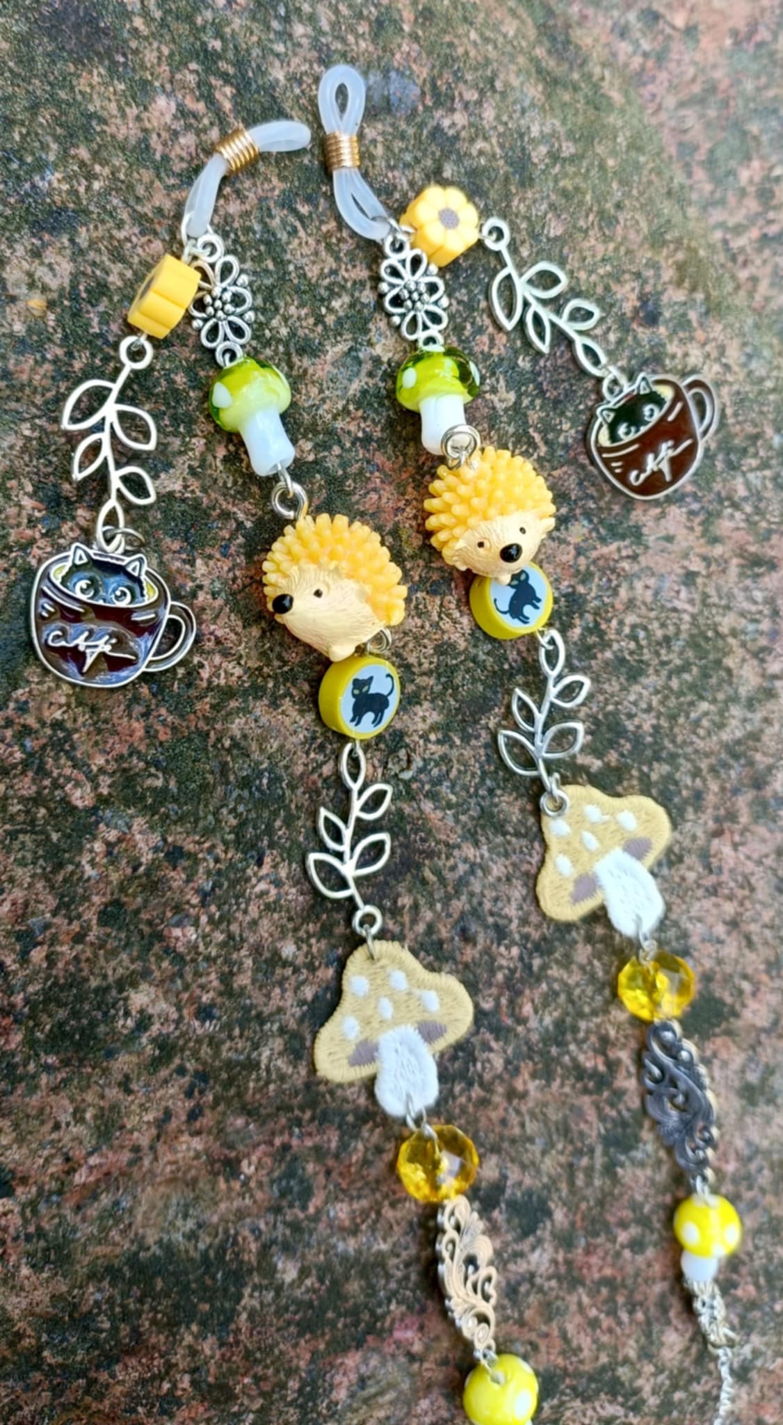Stylish eyeglasses chains featuring acrylic resin and glass ornaments attached to a durable steel chain. Perfect for a fashionable and functional accessory to keep your glasses secure and add a touch of elegance to your look.