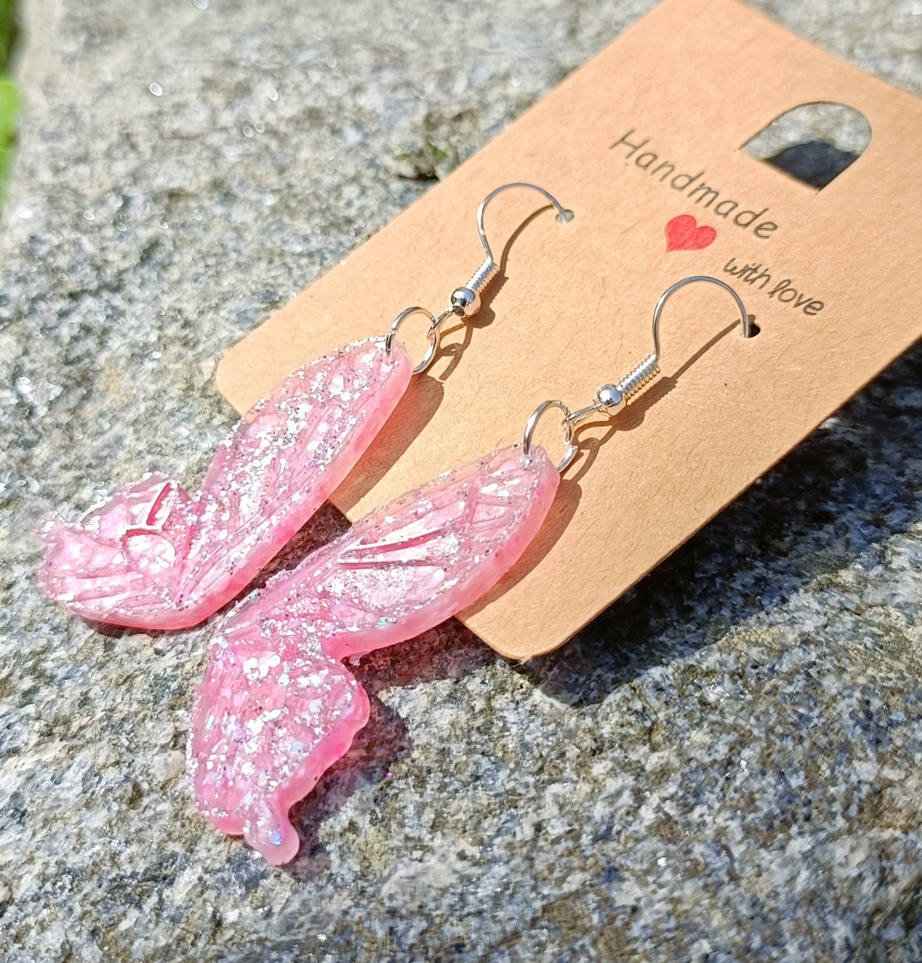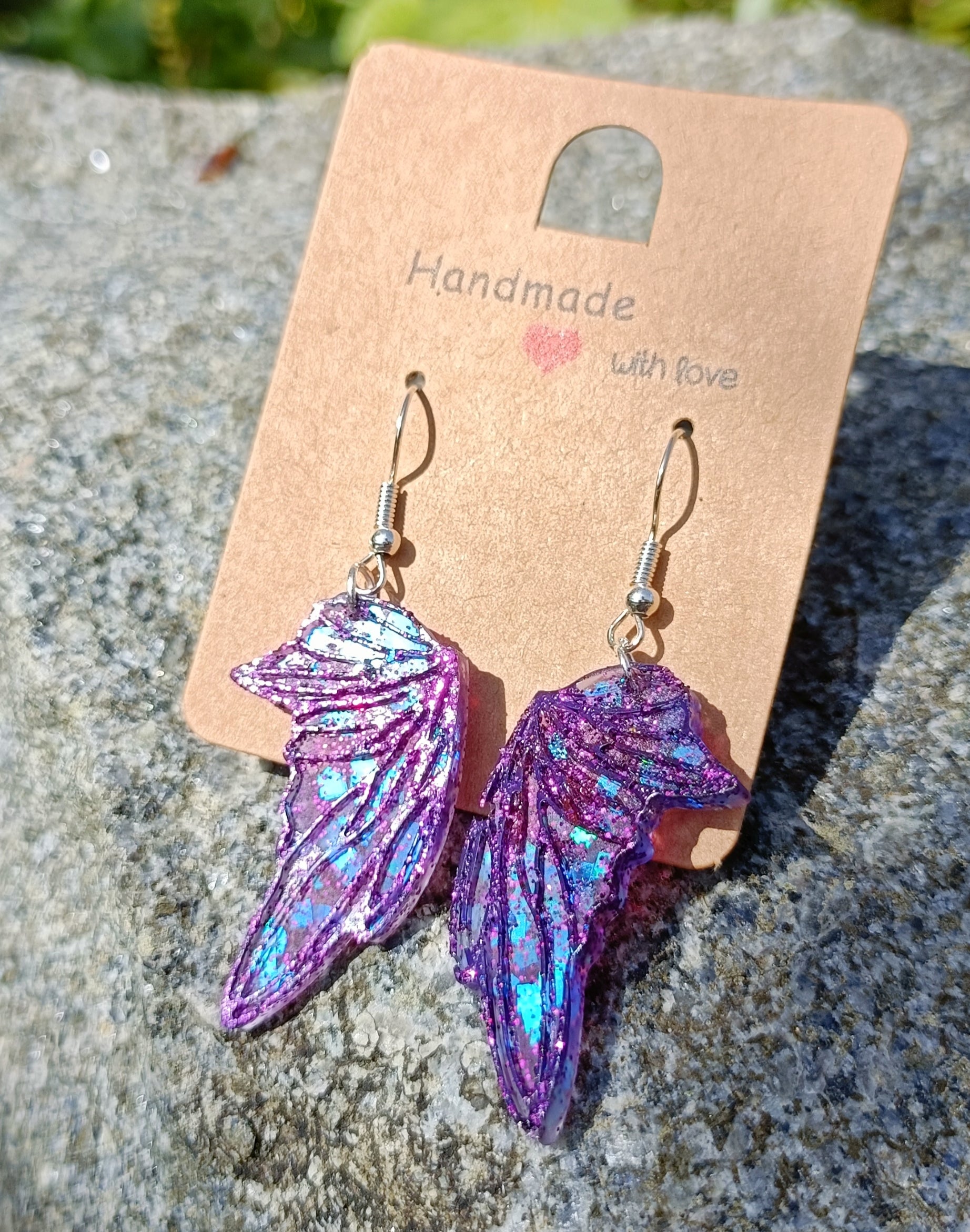Whimsical and ethereal, these handcrafted fairy wing earrings are cast in resin and delicately hand-painted to capture the shimmer and grace of mythical wings. Each pair is sealed with a protective varnish to enhance shine and durability, ensuring they remain vibrant and magical over time. Lightweight and dreamy, they’re perfect for fantasy lovers and free spirits alike.
