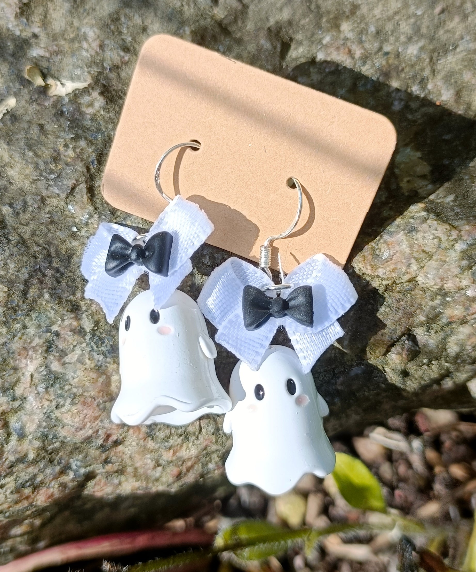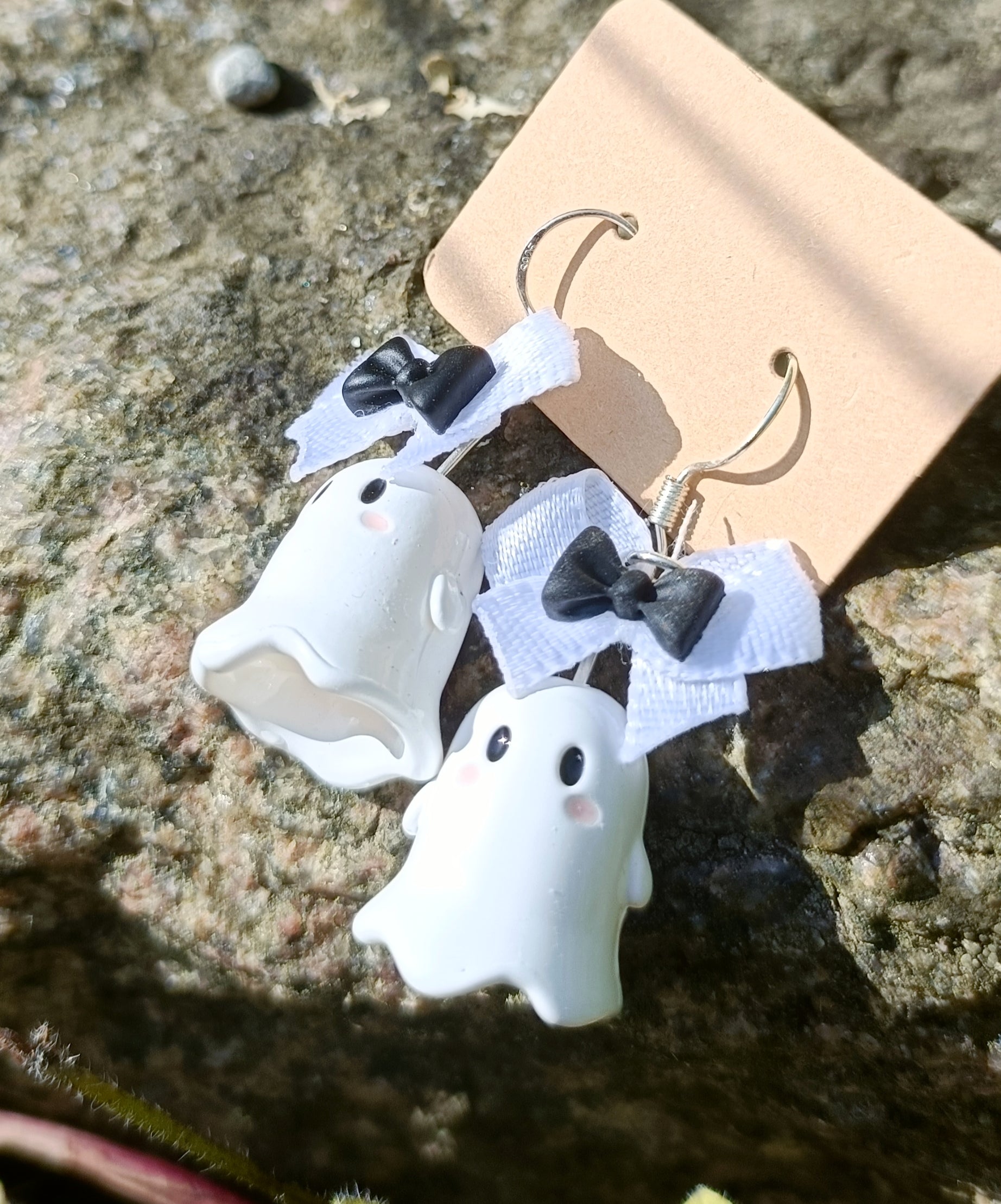 Sweet meets spooky with these adorable Ghost & Bow Earrings, perfect for adding a touch of Halloween charm (or year-round ghost girl vibes) to your outfit. Each pair features tiny acrylic ghosts with expressive faces, dangling delicately from soft satin ribbon bows for the perfect mix of eerie and elegant.