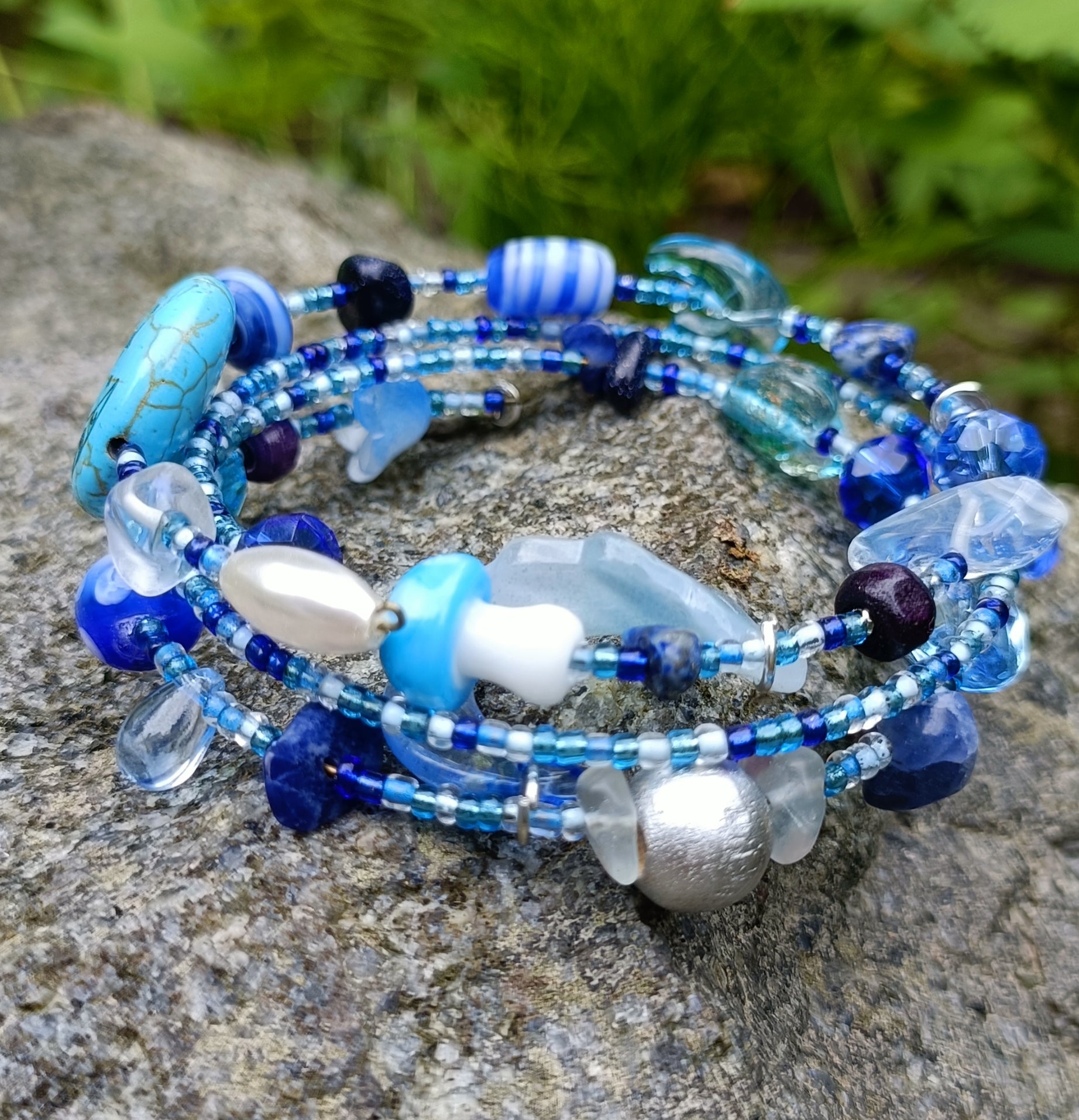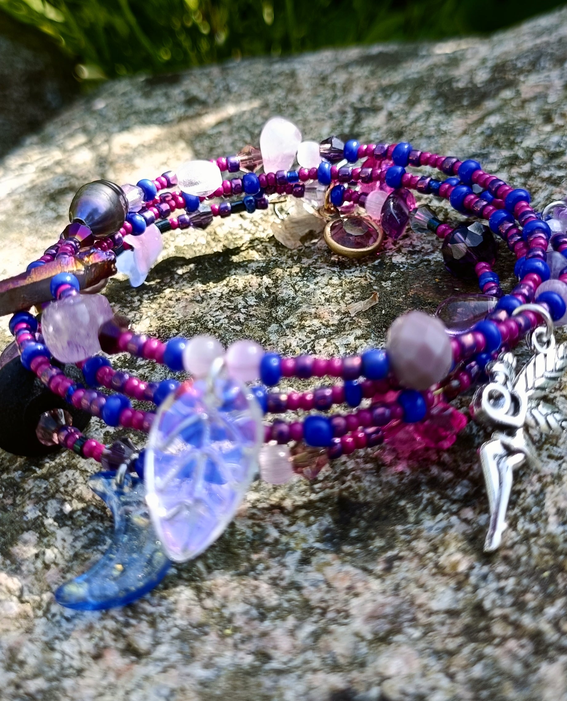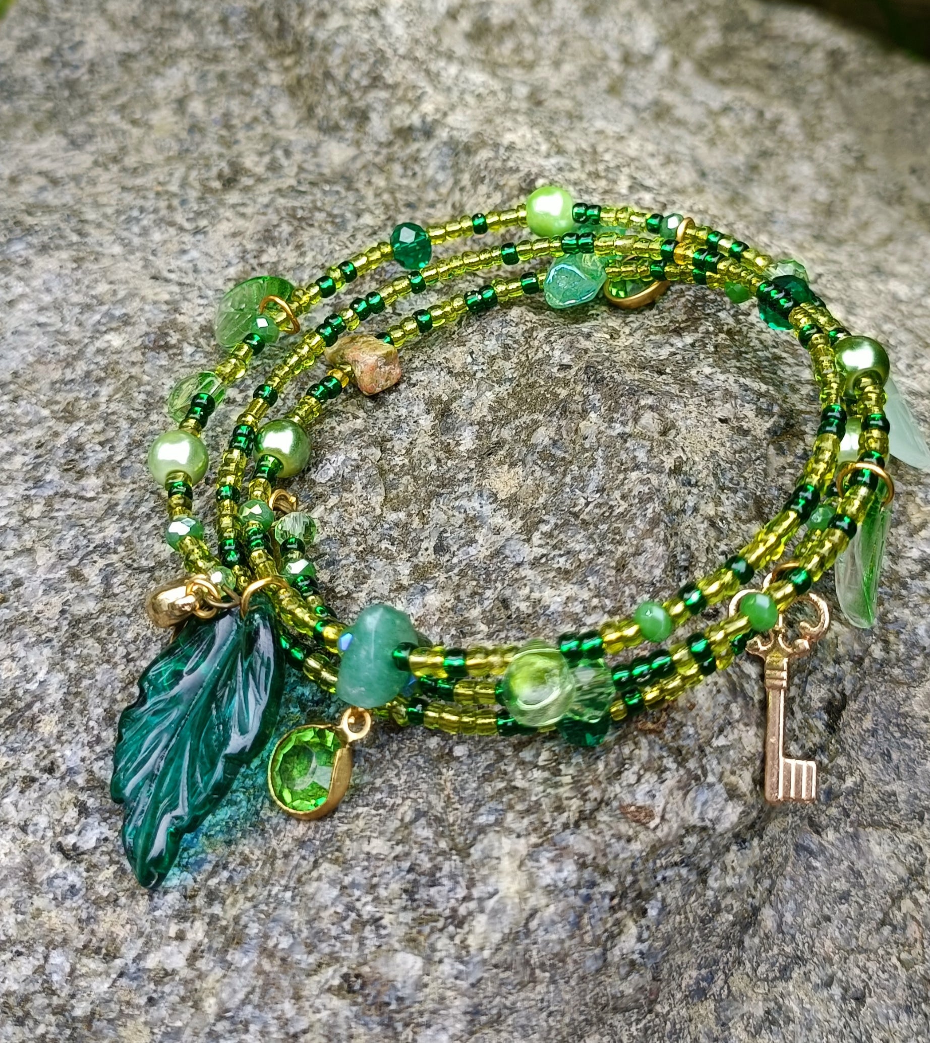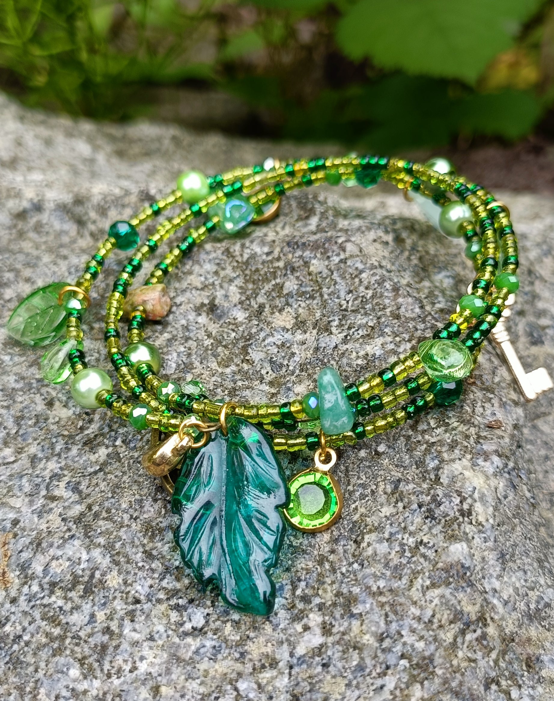 This handmade Glass Charm Bracelet is a delicate dance of color and movement, featuring vibrant glass beads and charms woven onto a sturdy steel spiral base. Each charm catches the light beautifully, creating a playful shimmer with every flick of the wrist.