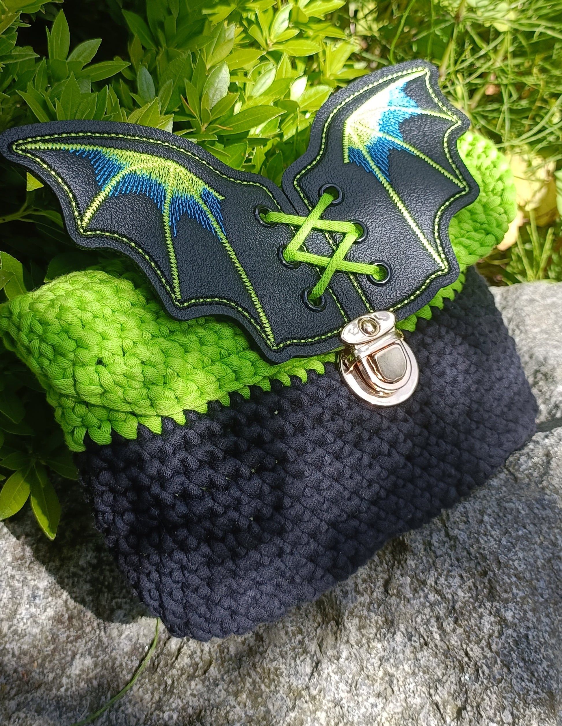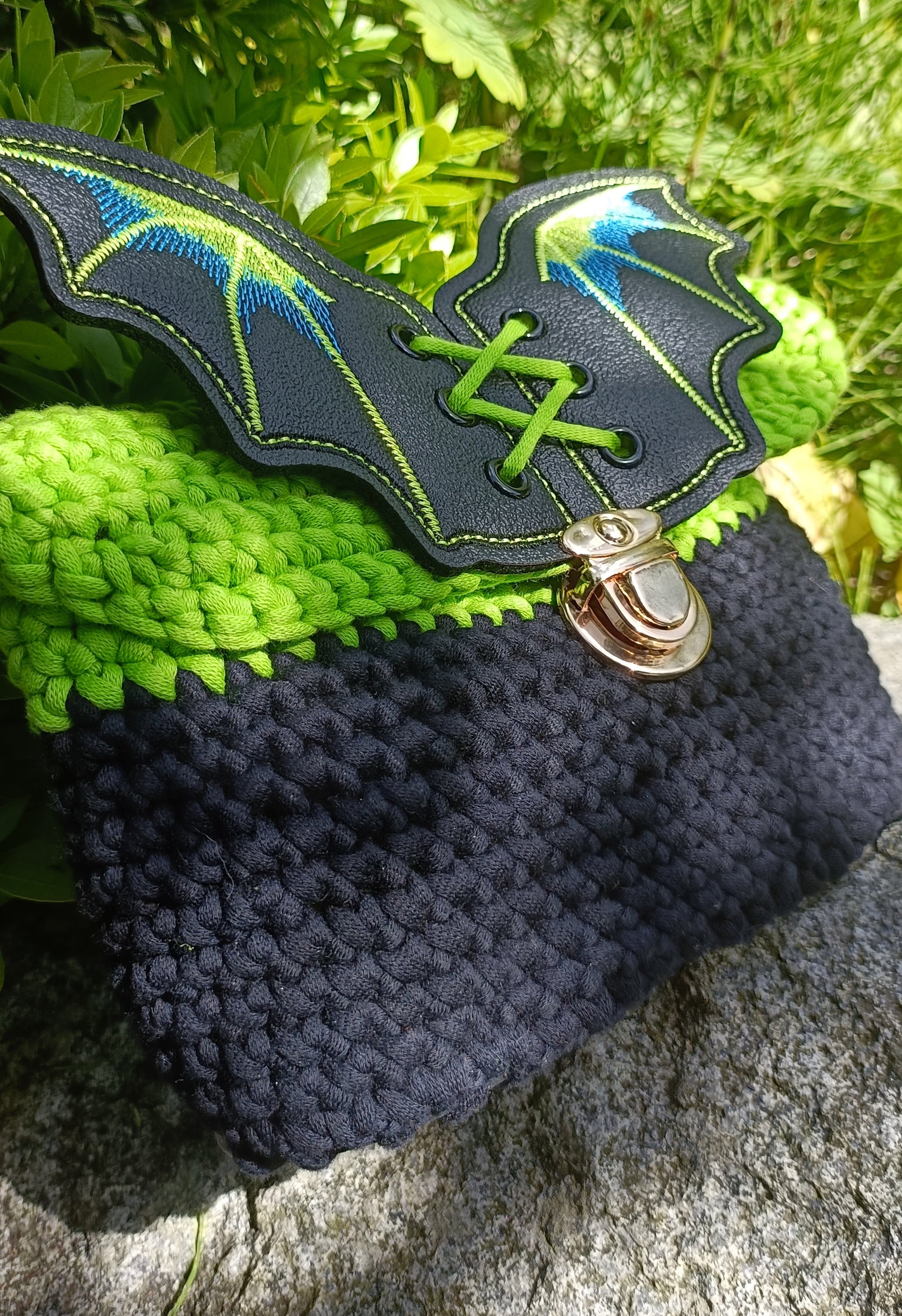 Drape yourself in dark elegance with the Green Batwing Purse, a handmade crochet cotton accessory featuring embroidered details and bold batwing-inspired shaping. Accented with leather elements, this purse is perfect for gothic, vampire, and alternative fashion lovers who want to carry a little nocturnal magic with them.