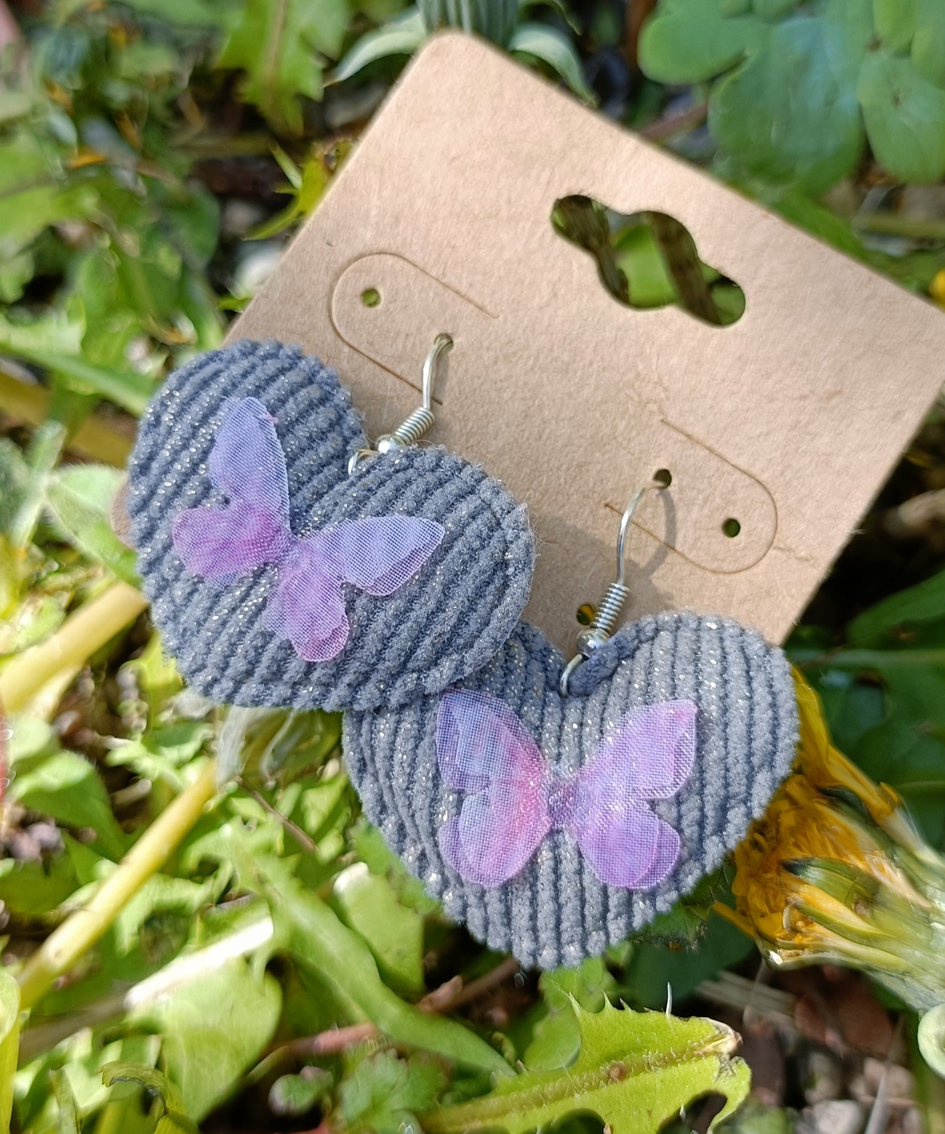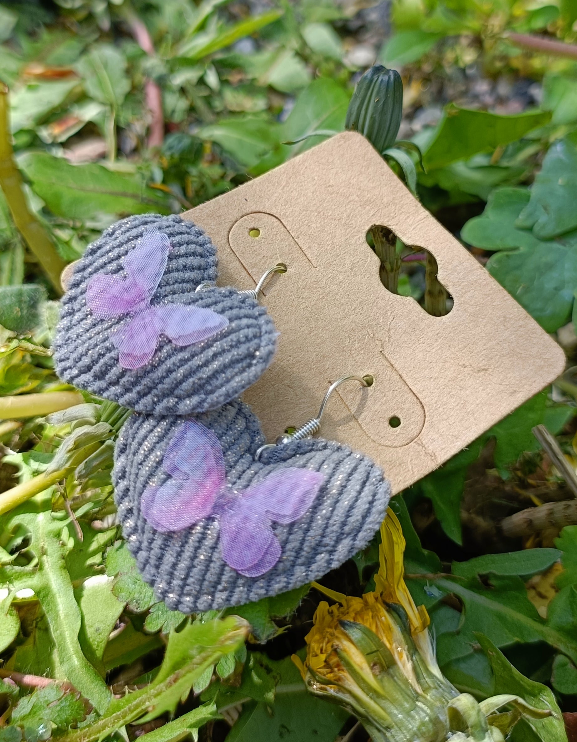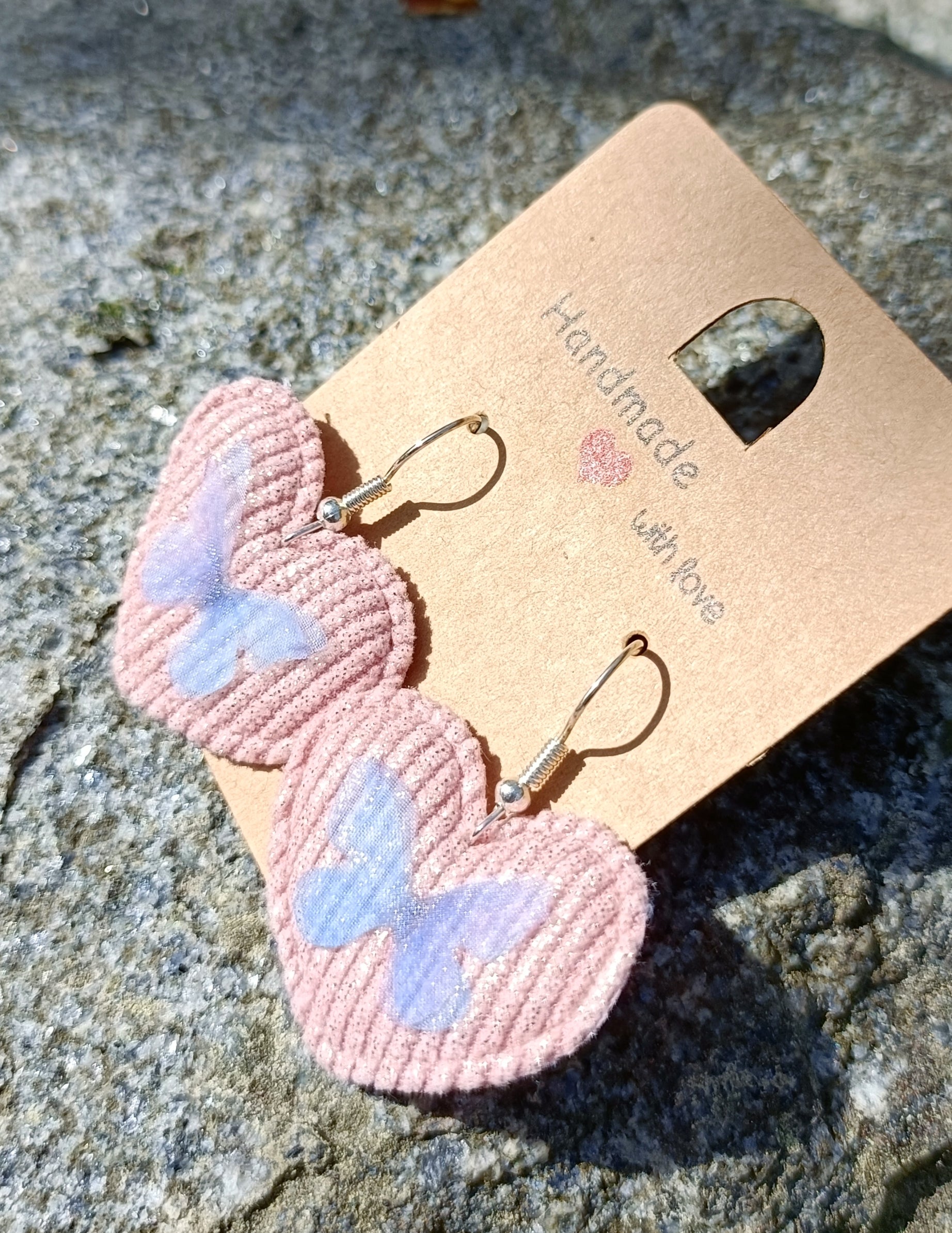 Delicate and eye-catching, these handmade earrings feature a detailed chiffon butterfly, set on a soft cotton heart-shaped base. The charming combination of floral and heart elements makes them a perfect accessory for nature lovers or romantic styles. Finished with hypoallergenic steel hooks for secure and comfortable wear.