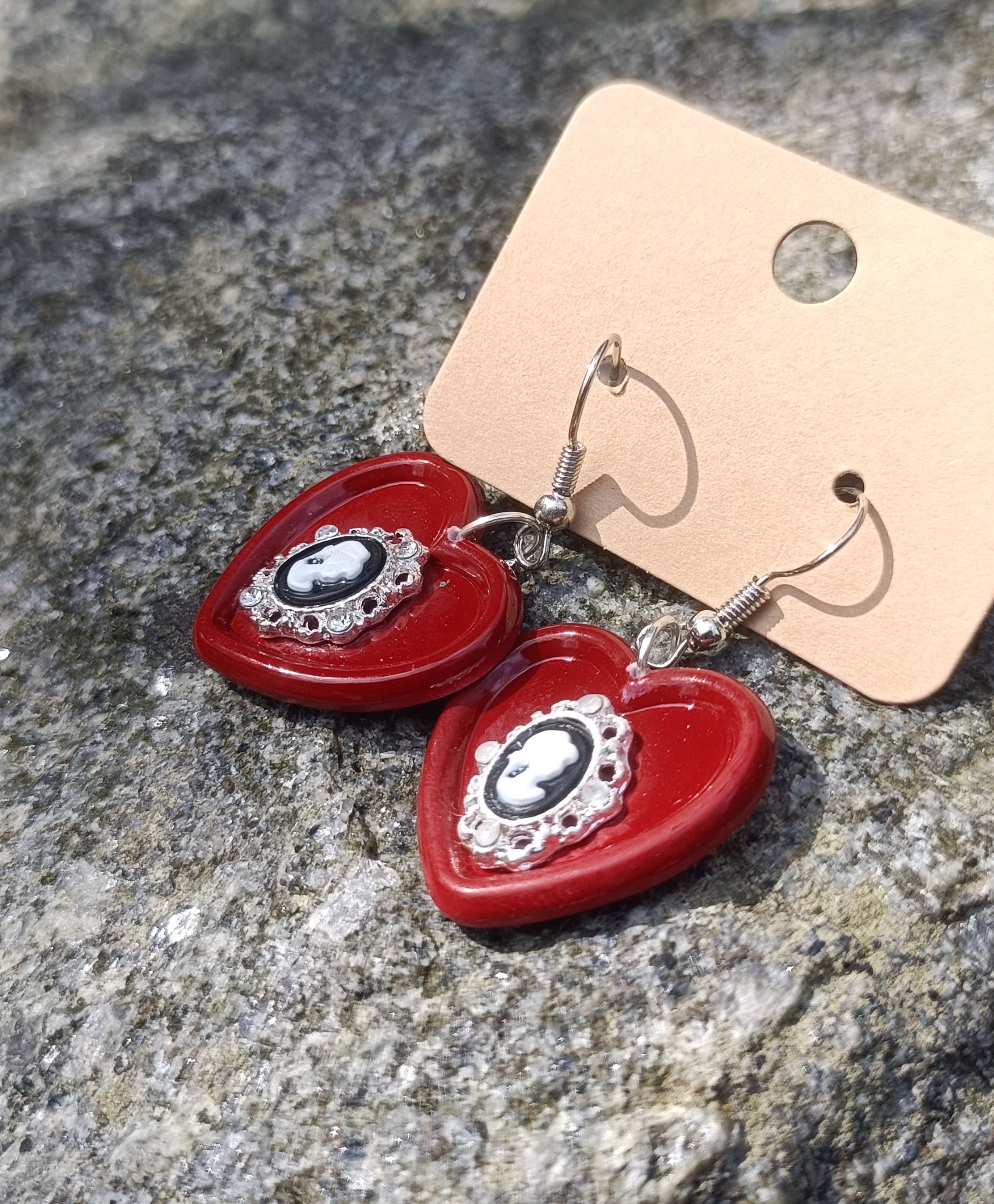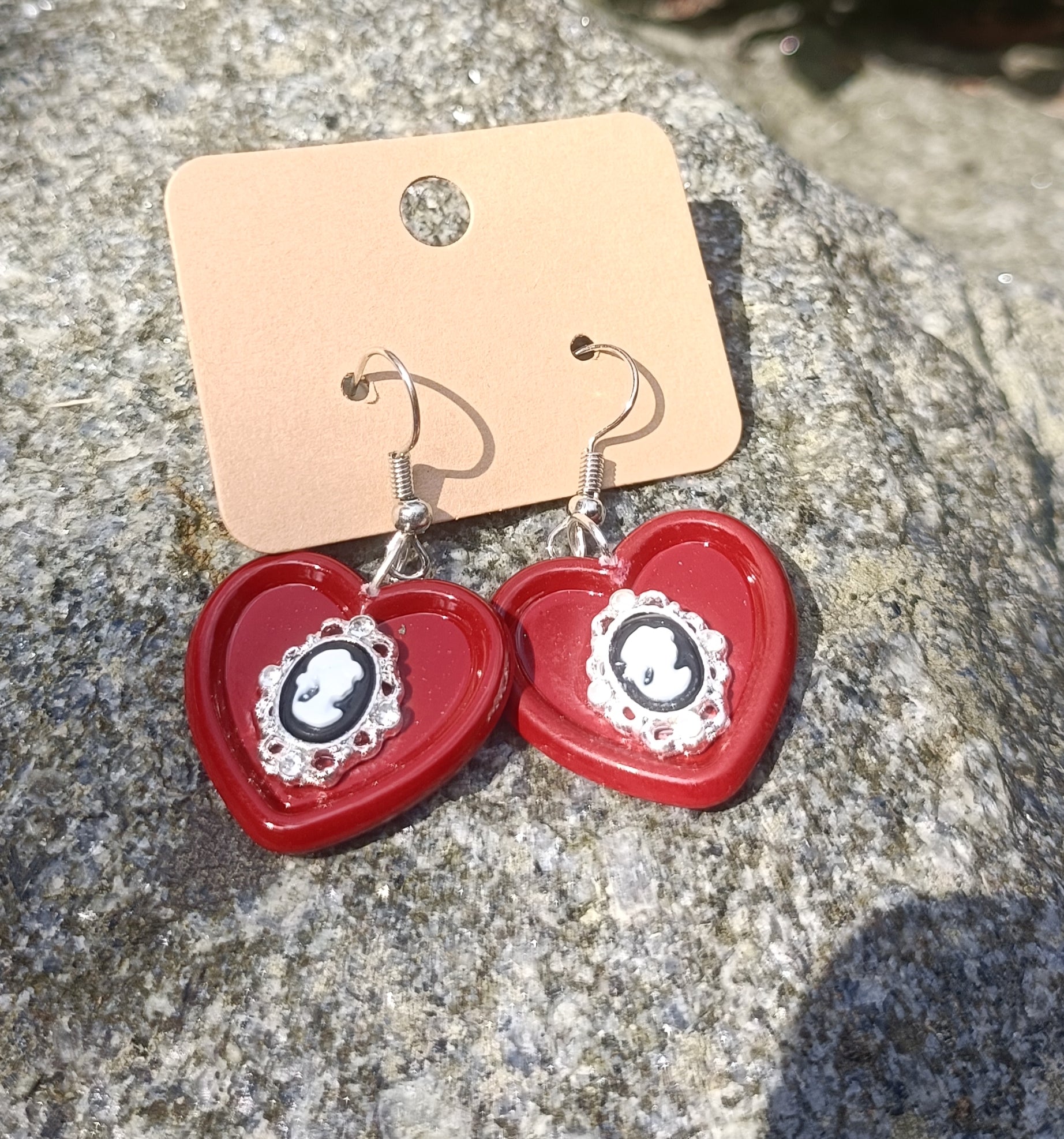 Add a dash of vintage charm with these handmade Heart Button & Victorian Portrait earrings. Each pair features a glossy resin heart button paired with a delicate acrylic miniature portrait, hanging from sturdy steel hooks for comfortable wear. Perfect for lovers of antique-inspired fashion and unique, artisan-crafted jewelry.