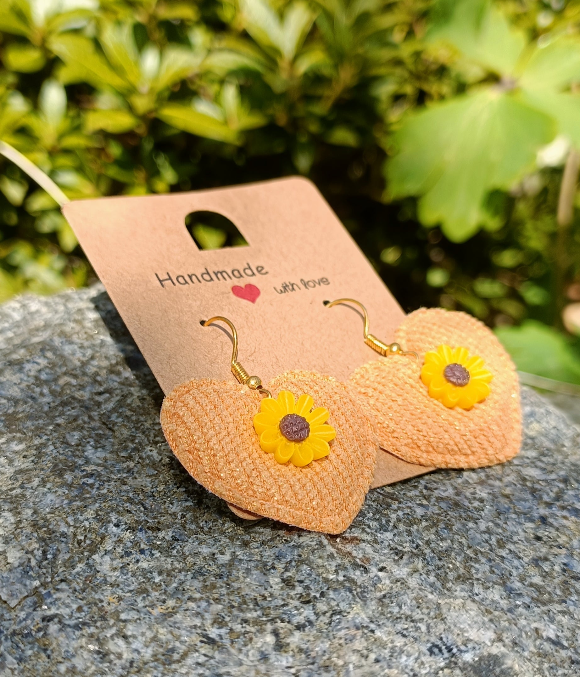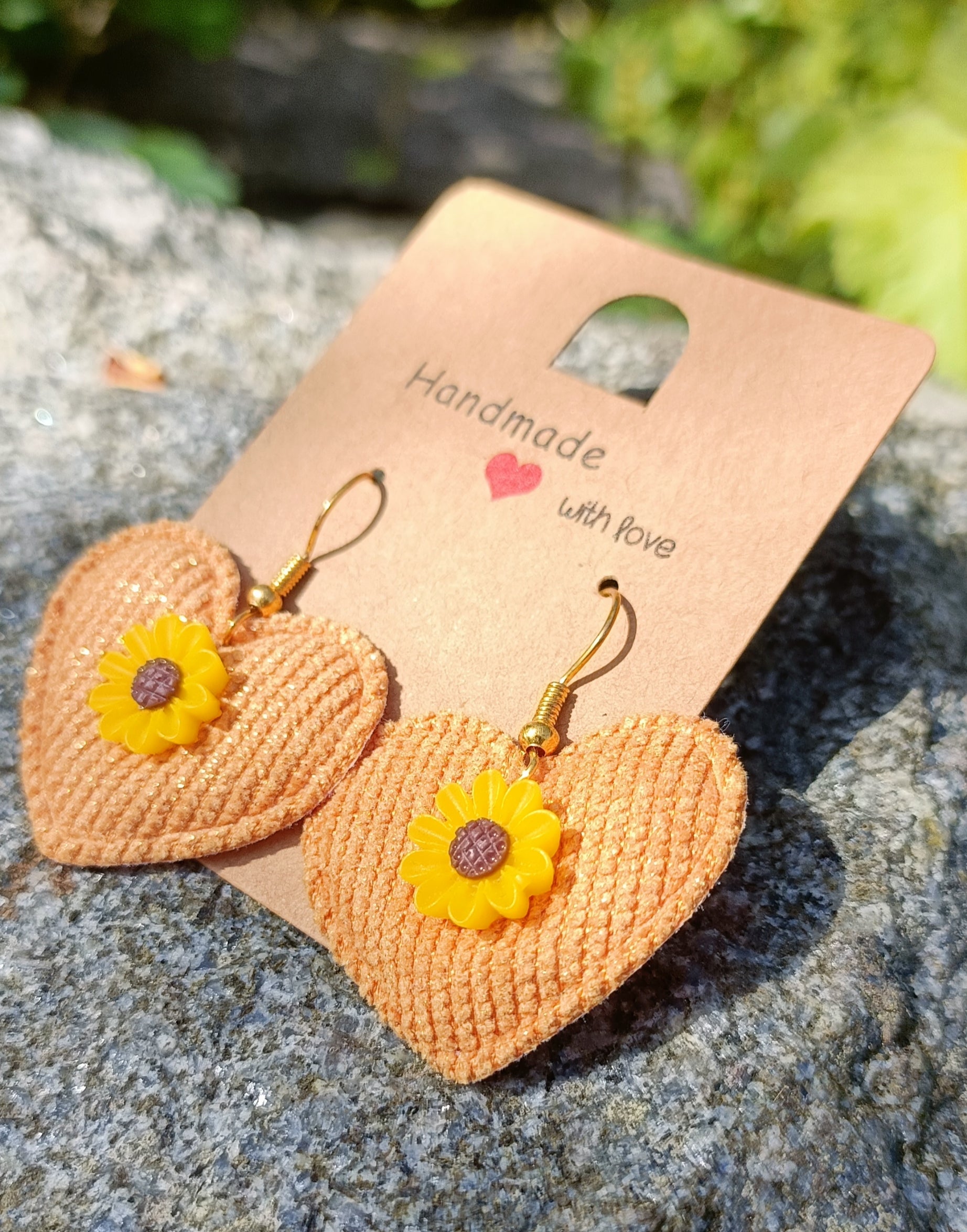 Delicate and eye-catching, these handmade earrings feature a detailed sunflower cast in resin, set on a soft cotton heart-shaped base. The charming combination of floral and heart elements makes them a perfect accessory for nature lovers or romantic styles. Finished with hypoallergenic steel hooks for secure and comfortable wear.