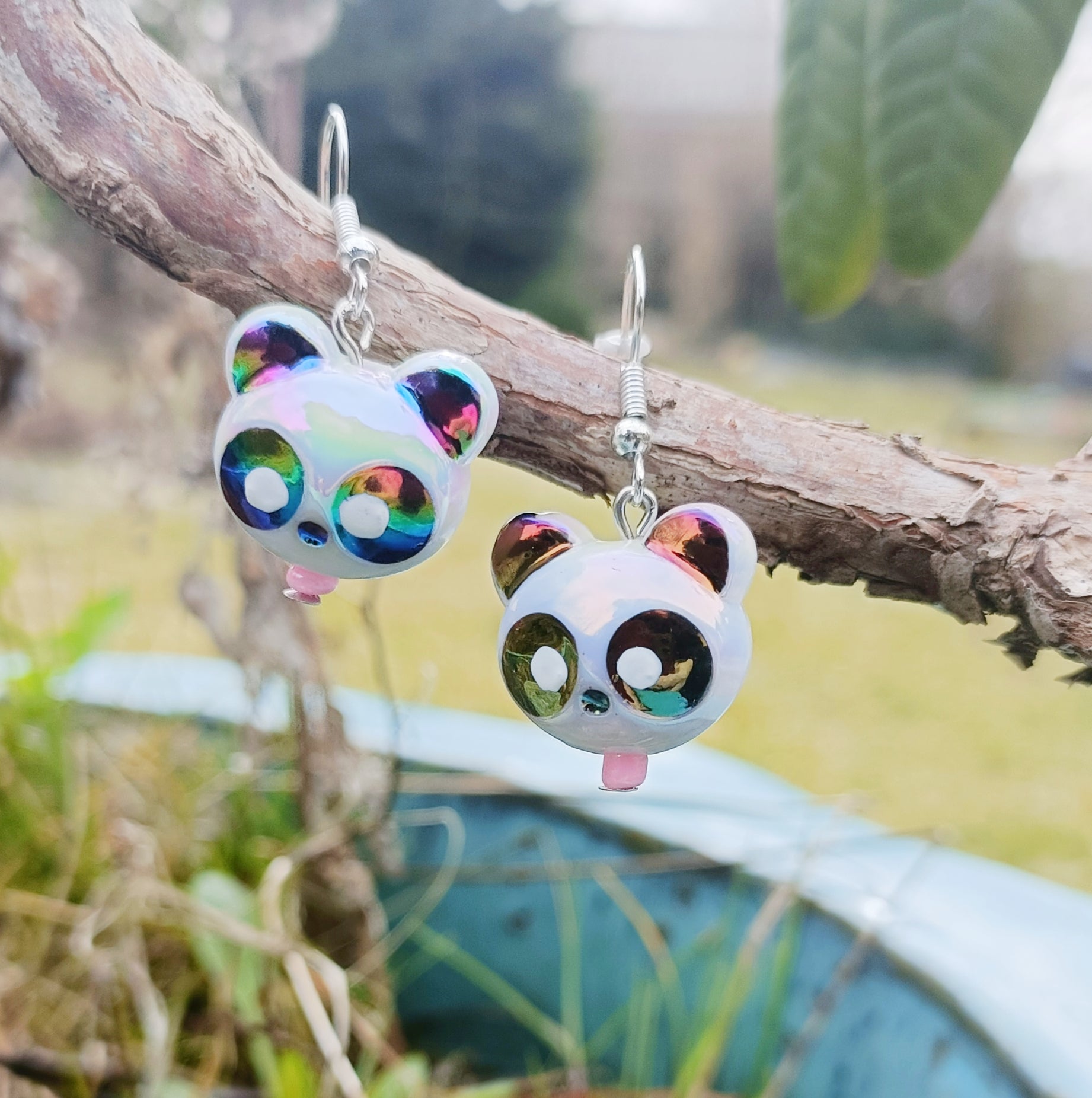Bring a playful and magical touch to your jewelry collection with these Iridescent Panda Earrings. Crafted with care, each earring features a handpainted resin panda ornament, capturing the adorable and lovable essence of this iconic animal. The pandas are finished with a stunning iridescent glaze, giving them a subtle, magical shimmer that catches the light beautifully. Suspended on durable steel hooks, these earrings are both lightweight and comfortable, making them perfect for all-day wear.