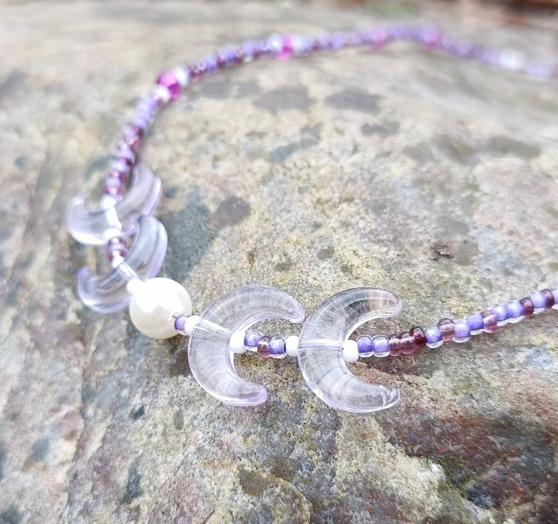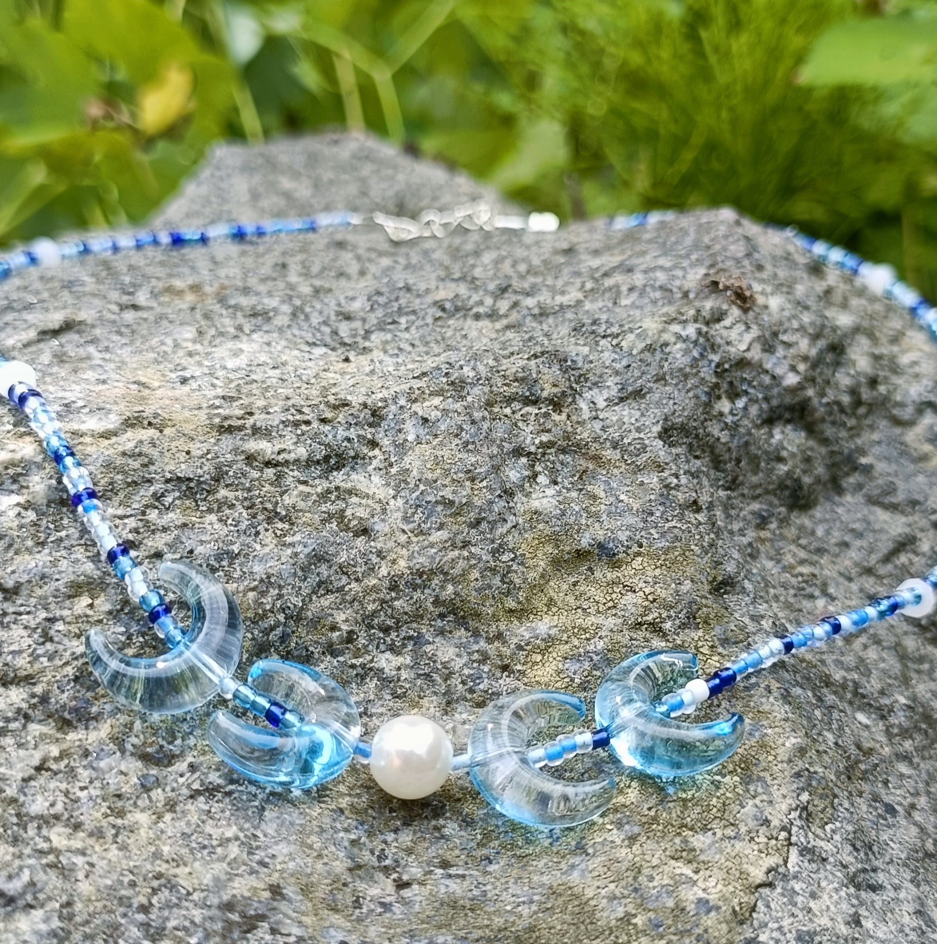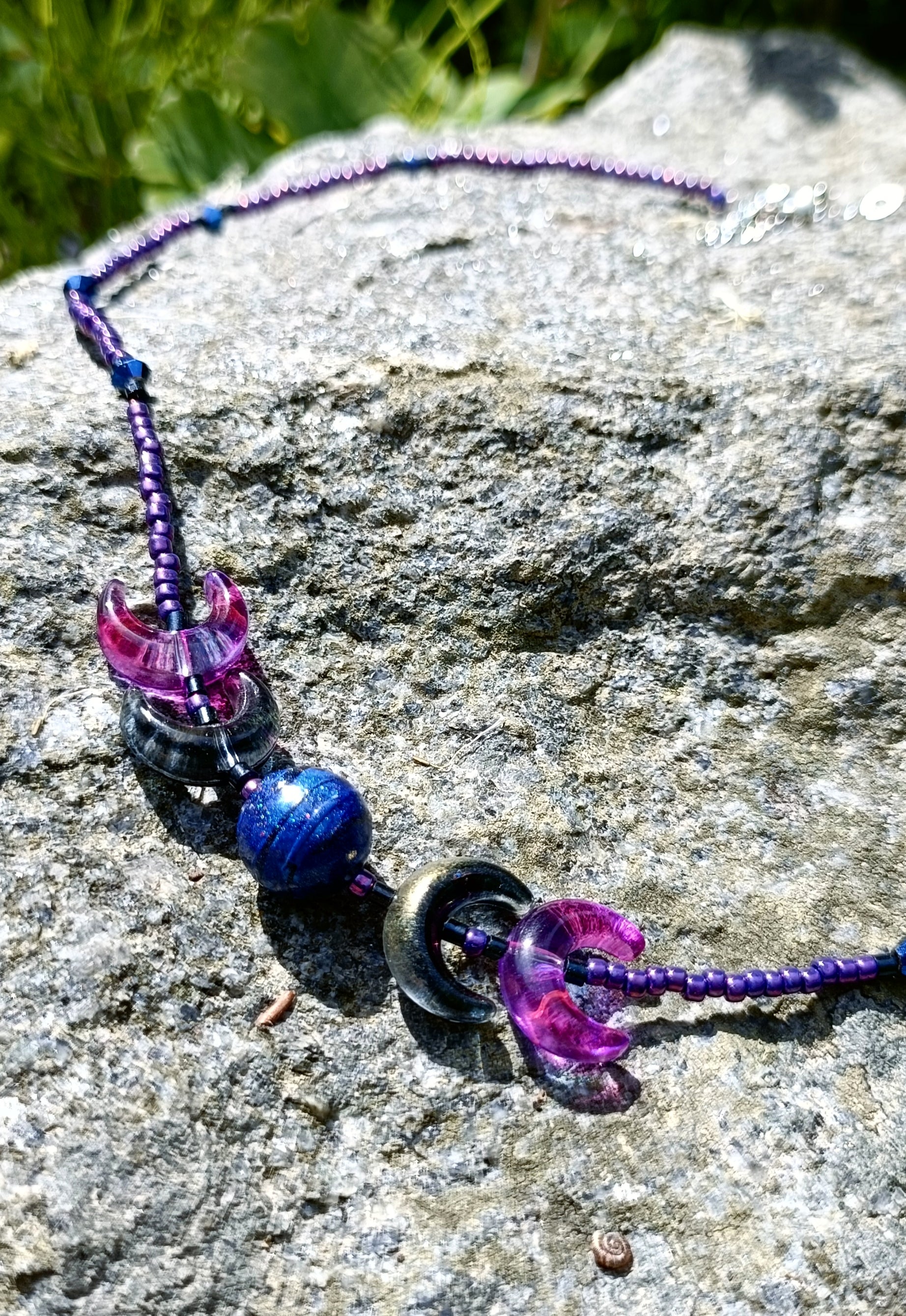 This stunning handmade Moon Goddess Necklace is a true tribute to the mystical beauty of the night sky. Carefully crafted with glass beads and intricate ornaments, this piece is designed to capture the essence of lunar energy and feminine strength. The beads shimmer like the stars, while the delicate, smooth glass elements are thoughtfully arranged on a sturdy steel wire, ensuring both elegance and durability.