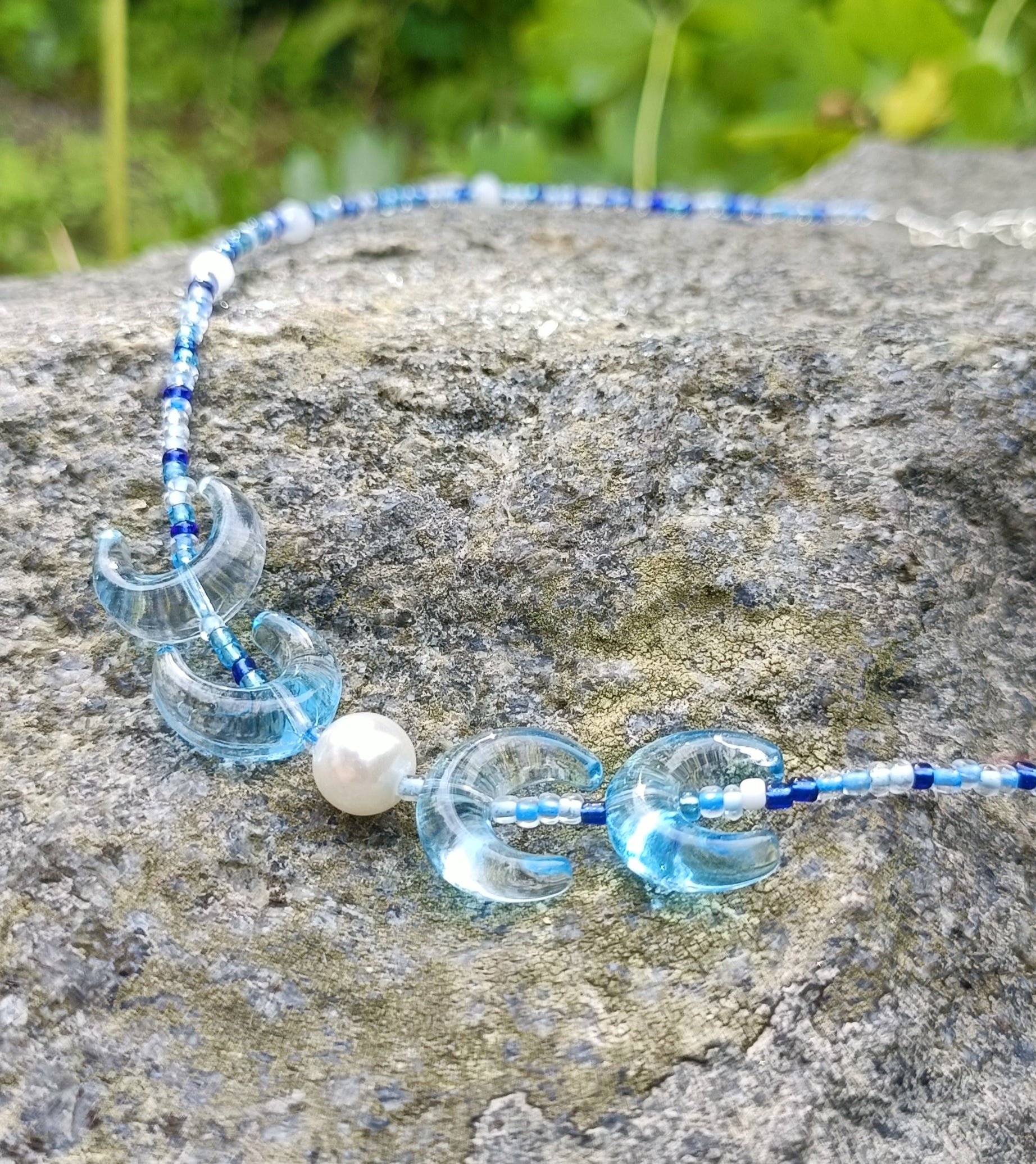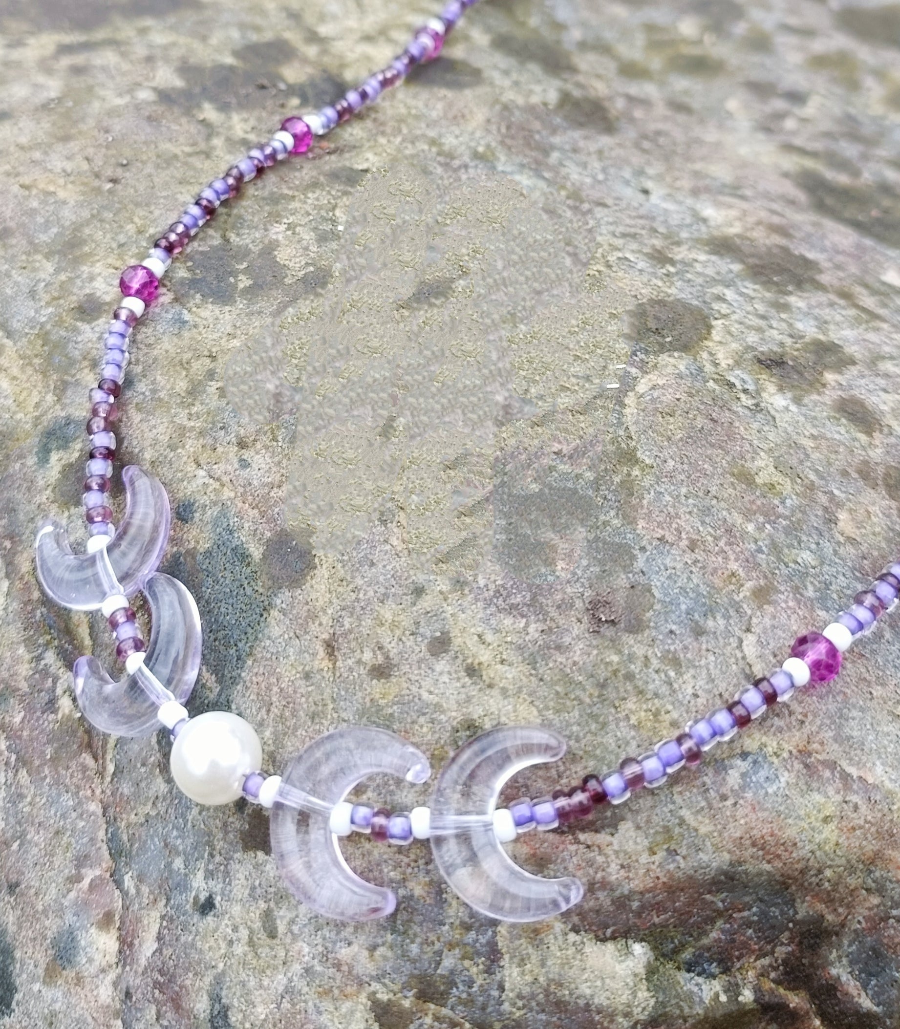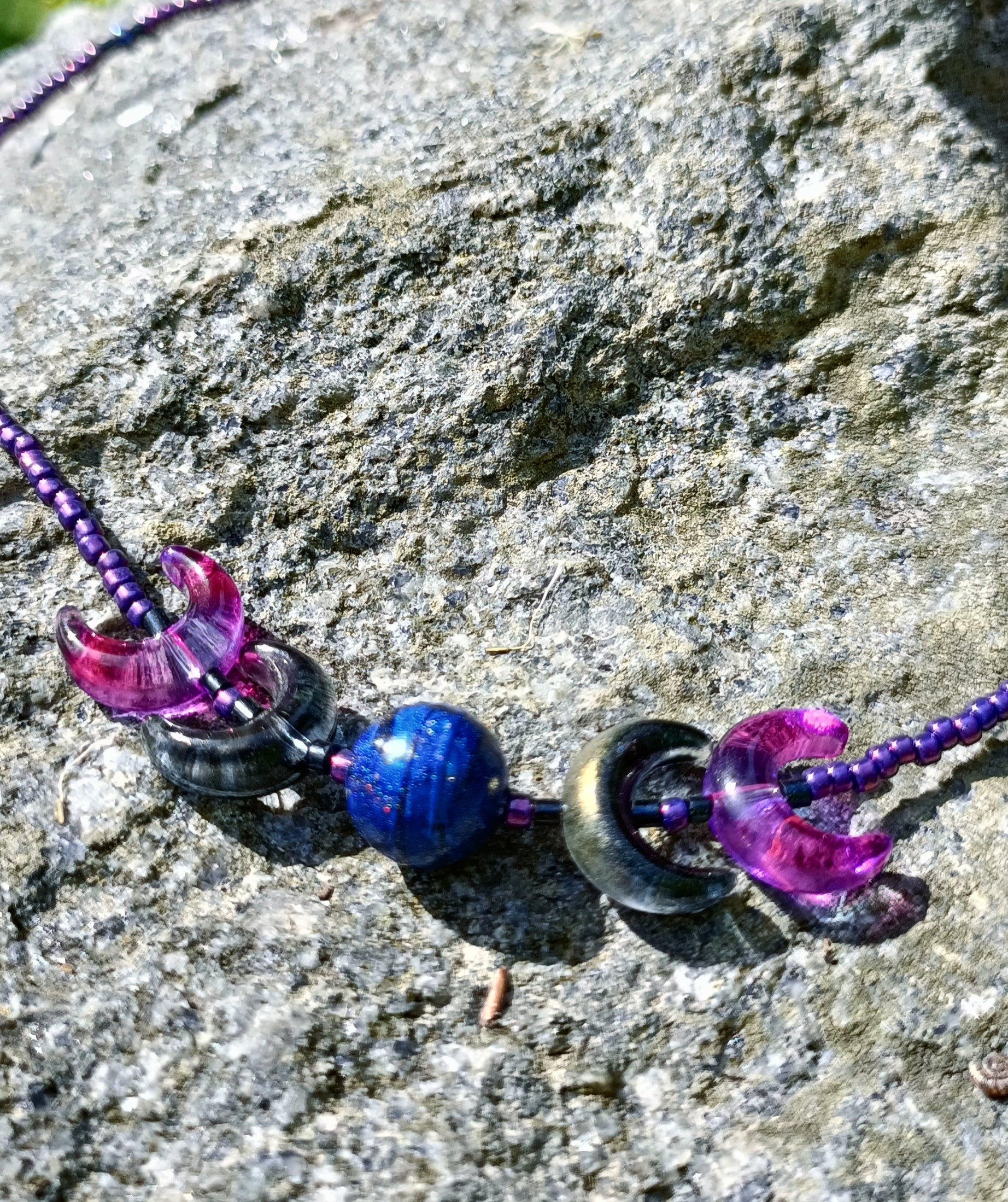 This stunning handmade Moon Goddess Necklace is a true tribute to the mystical beauty of the night sky. Carefully crafted with glass beads and intricate ornaments, this piece is designed to capture the essence of lunar energy and feminine strength. The beads shimmer like the stars, while the delicate, smooth glass elements are thoughtfully arranged on a sturdy steel wire, ensuring both elegance and durability.