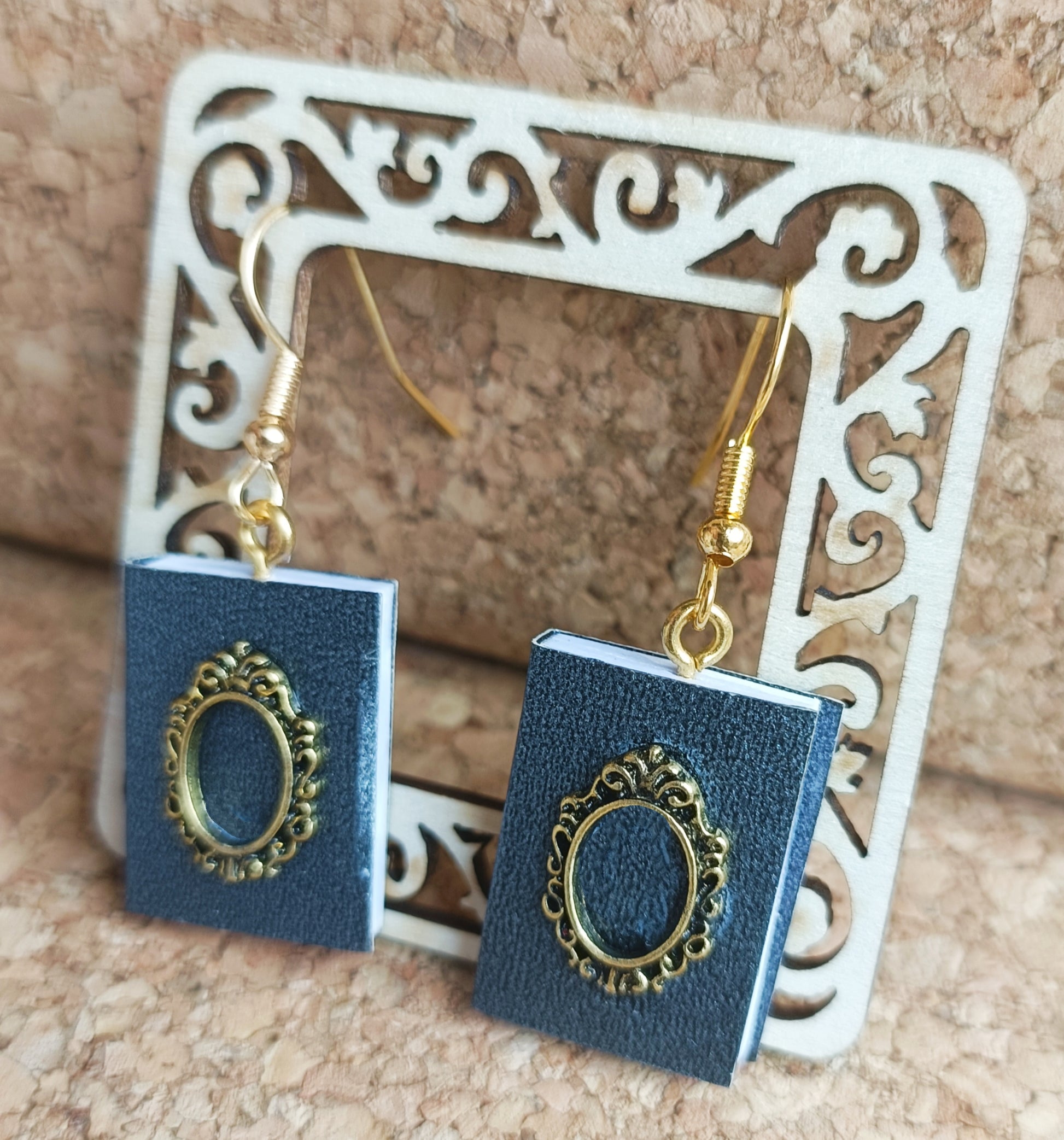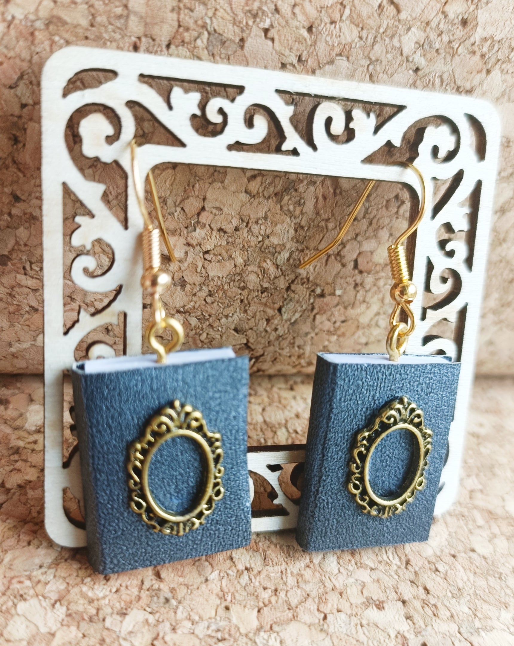 Wear your love for literature with these Navy Book Earrings, featuring real miniature books handcrafted from paper and adorned with delicate acrylic ornaments. These unique earrings are perfect for book lovers, writers, and anyone who adores whimsical accessories with a touch of elegance.