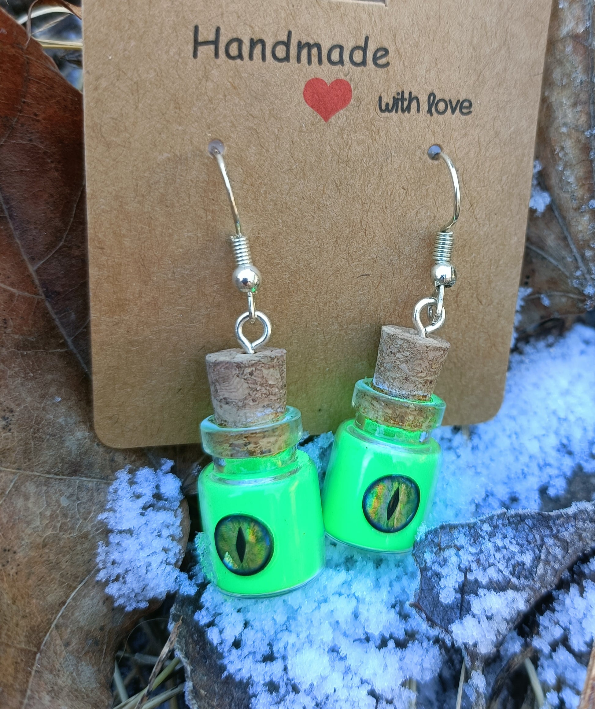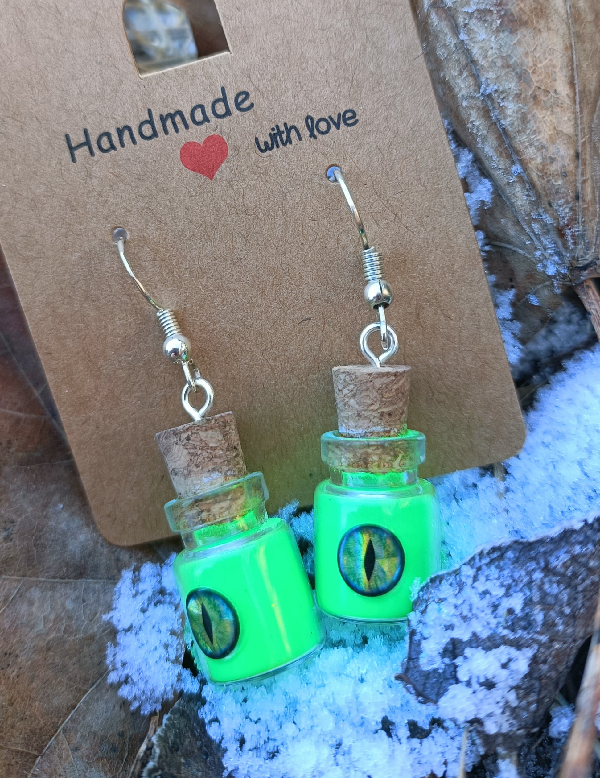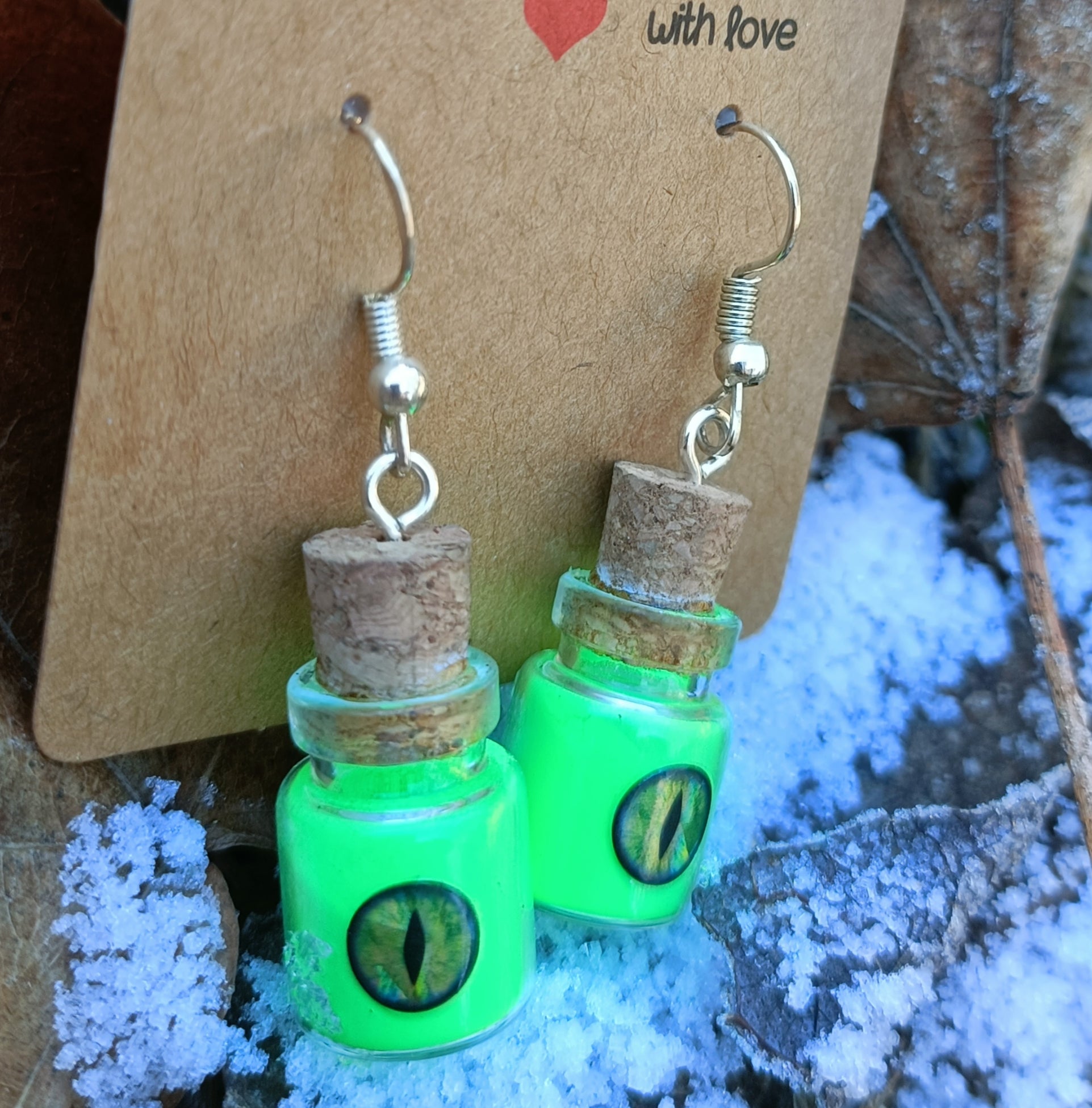 Dare to add a touch of danger and mystery to your look with these Poison Bottle Earrings, featuring tiny glass bottles filled with a glow in the dark green powder that mimics an enchanted elixir. Suspended from steel hooks, these earrings are the perfect accessory for witches, alchemists, and lovers of the macabre!