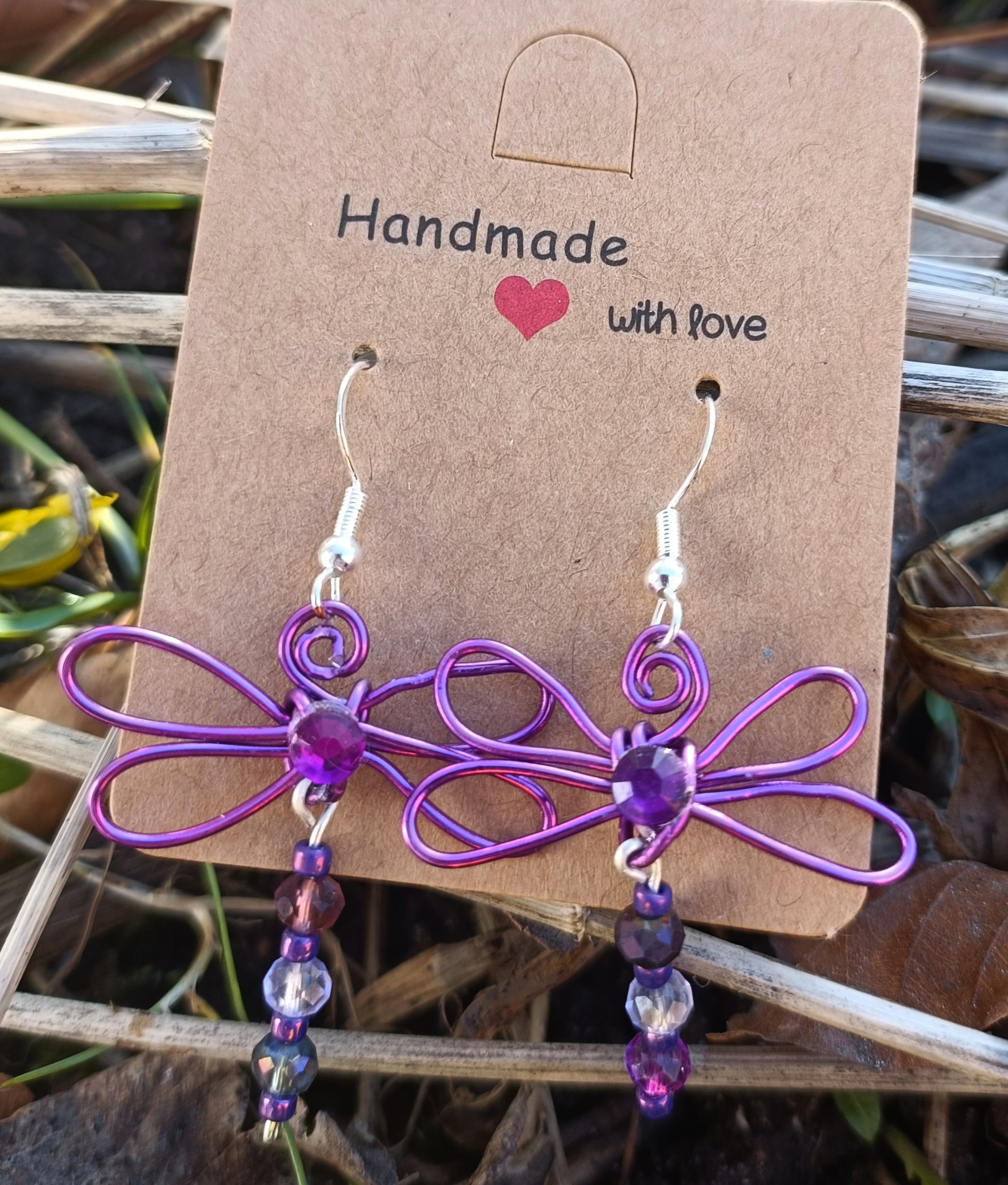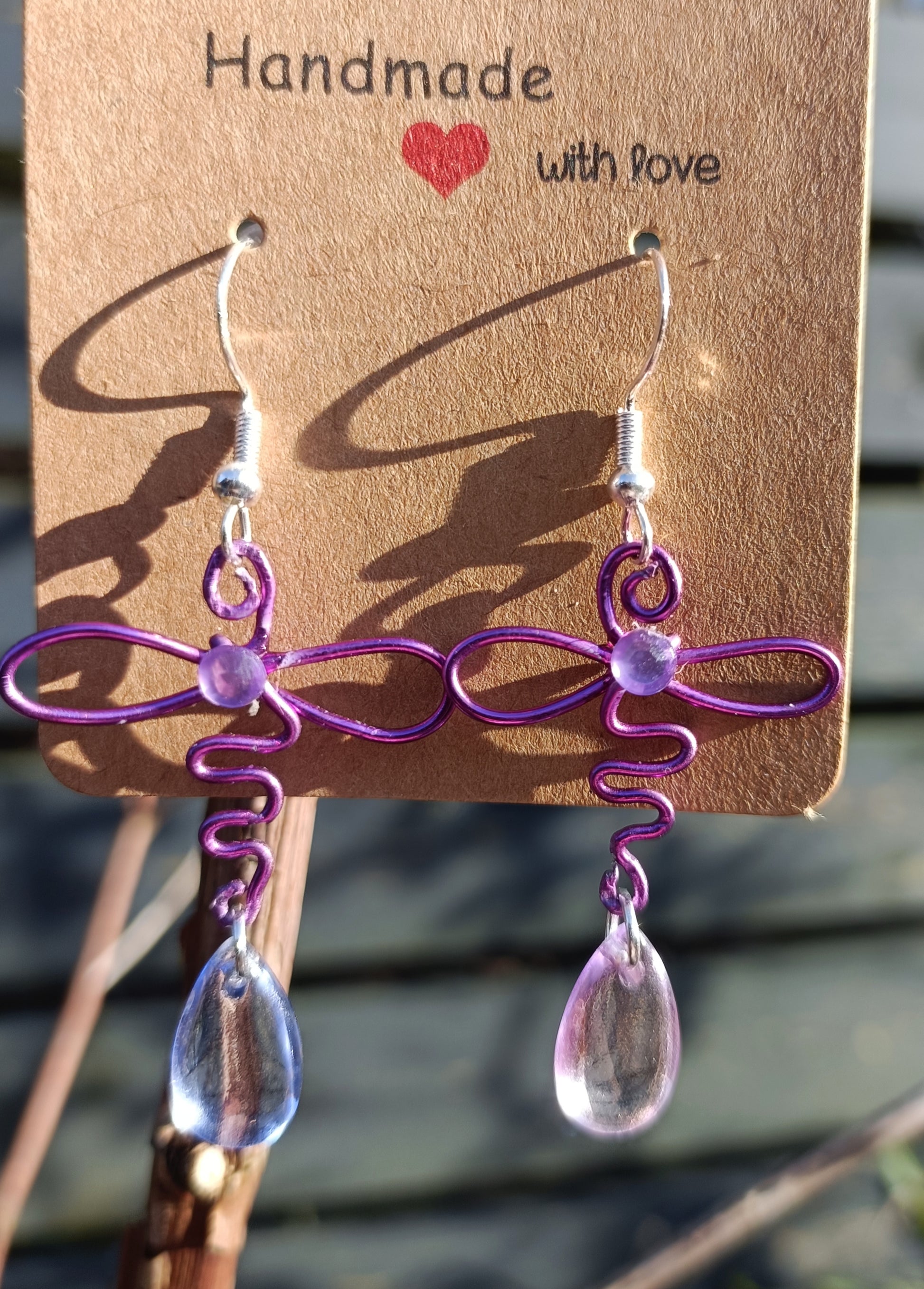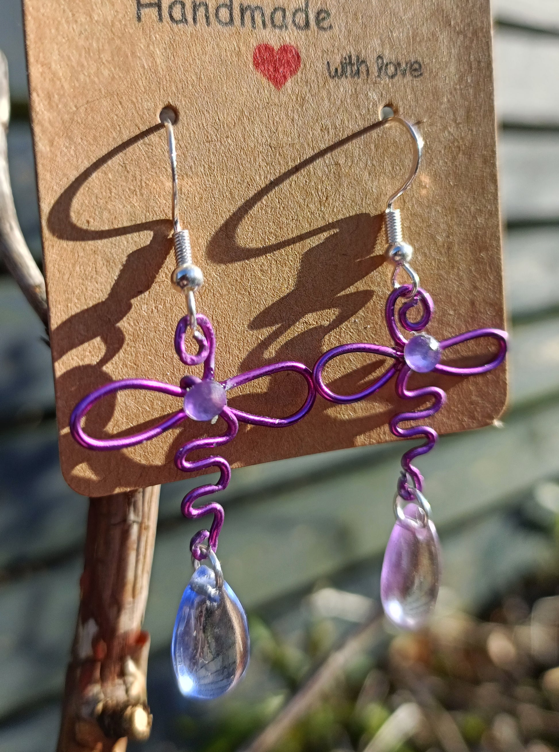 Embrace the magic of transformation with these Purple Dragonfly Earrings, a stunning fusion of artistry and nature. Crafted from lightweight purple aluminum wire, each earring showcases a delicately shaped dragonfly, symbolizing change, freedom, and harmony. Dangling below, shimmering glass drops and acrylic pearls add an enchanting touch, reflecting light beautifully with every movement.