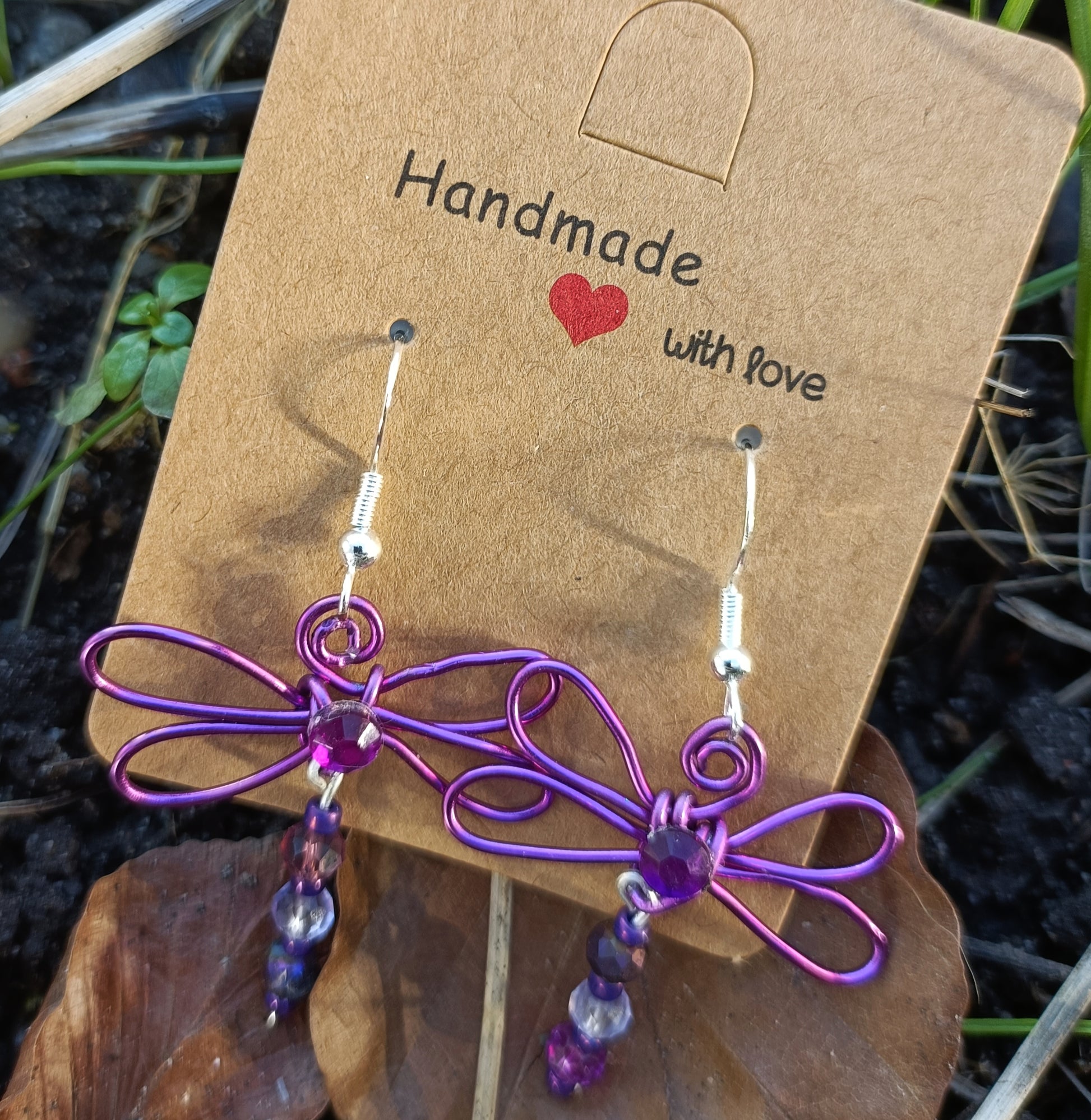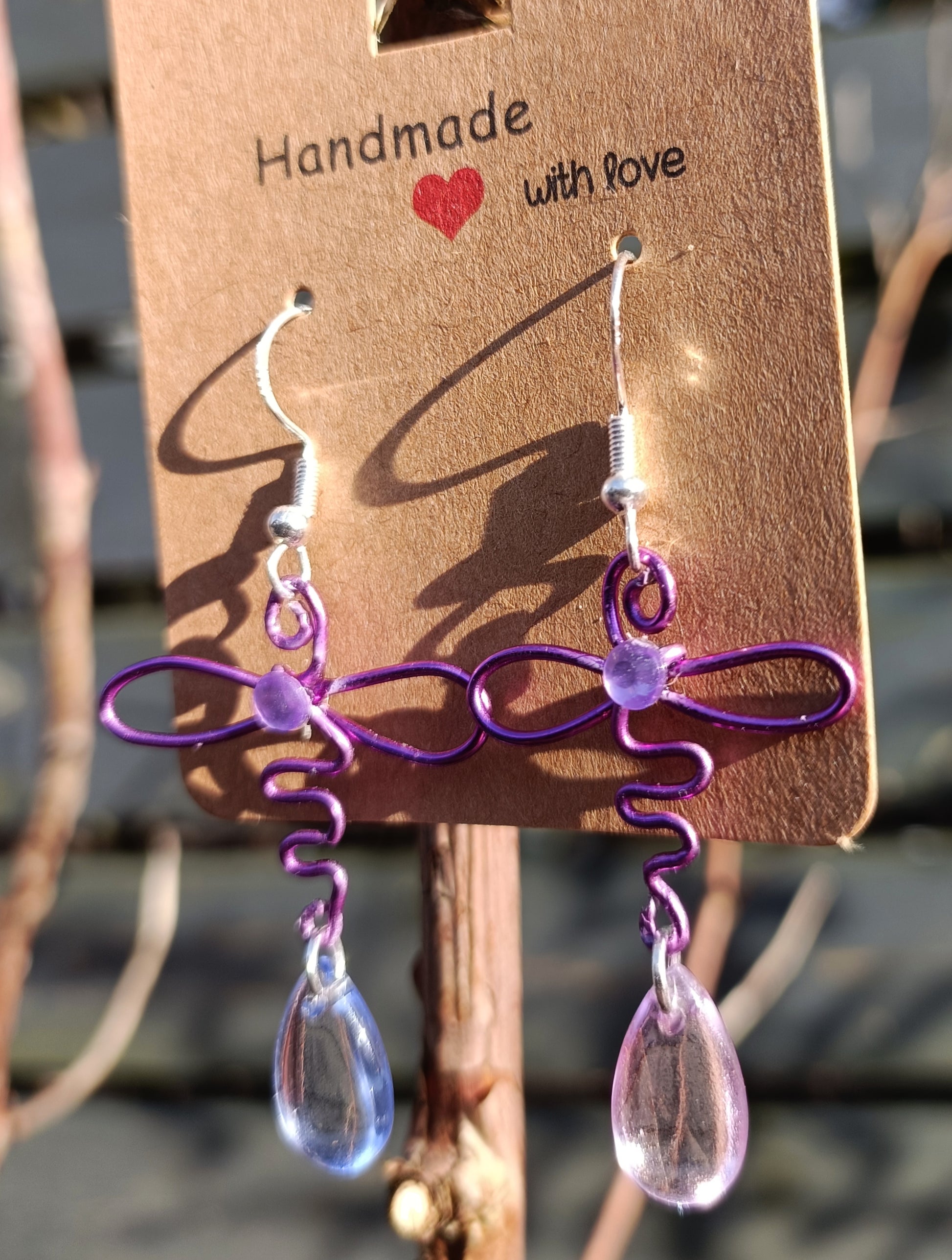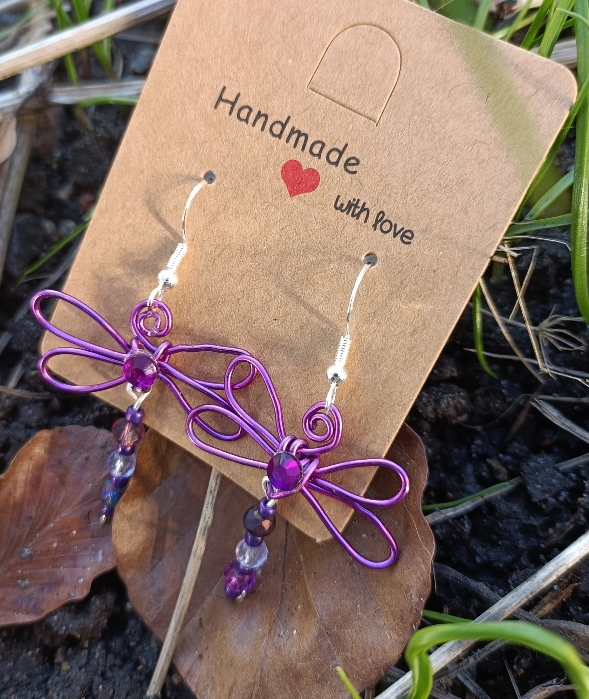 Embrace the magic of transformation with these Purple Dragonfly Earrings, a stunning fusion of artistry and nature. Crafted from lightweight purple aluminum wire, each earring showcases a delicately shaped dragonfly, symbolizing change, freedom, and harmony. Dangling below, shimmering glass drops and acrylic pearls add an enchanting touch, reflecting light beautifully with every movement.