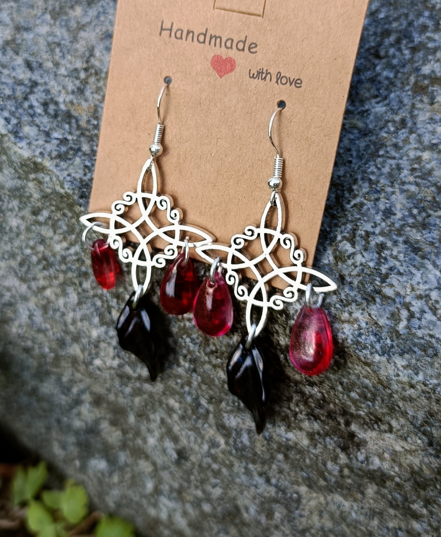 Bold and unique, these handmade Quaternary Knot earrings feature a meticulously crafted steel alloy pendant, symbolizing balance and harmony. The design is enhanced with vibrant glass drops and delicate ornaments that add movement and color. Hanging from durable steel hooks, these earrings are perfect for those who appreciate distinctive craftsmanship and meaningful symbolism in their accessories.