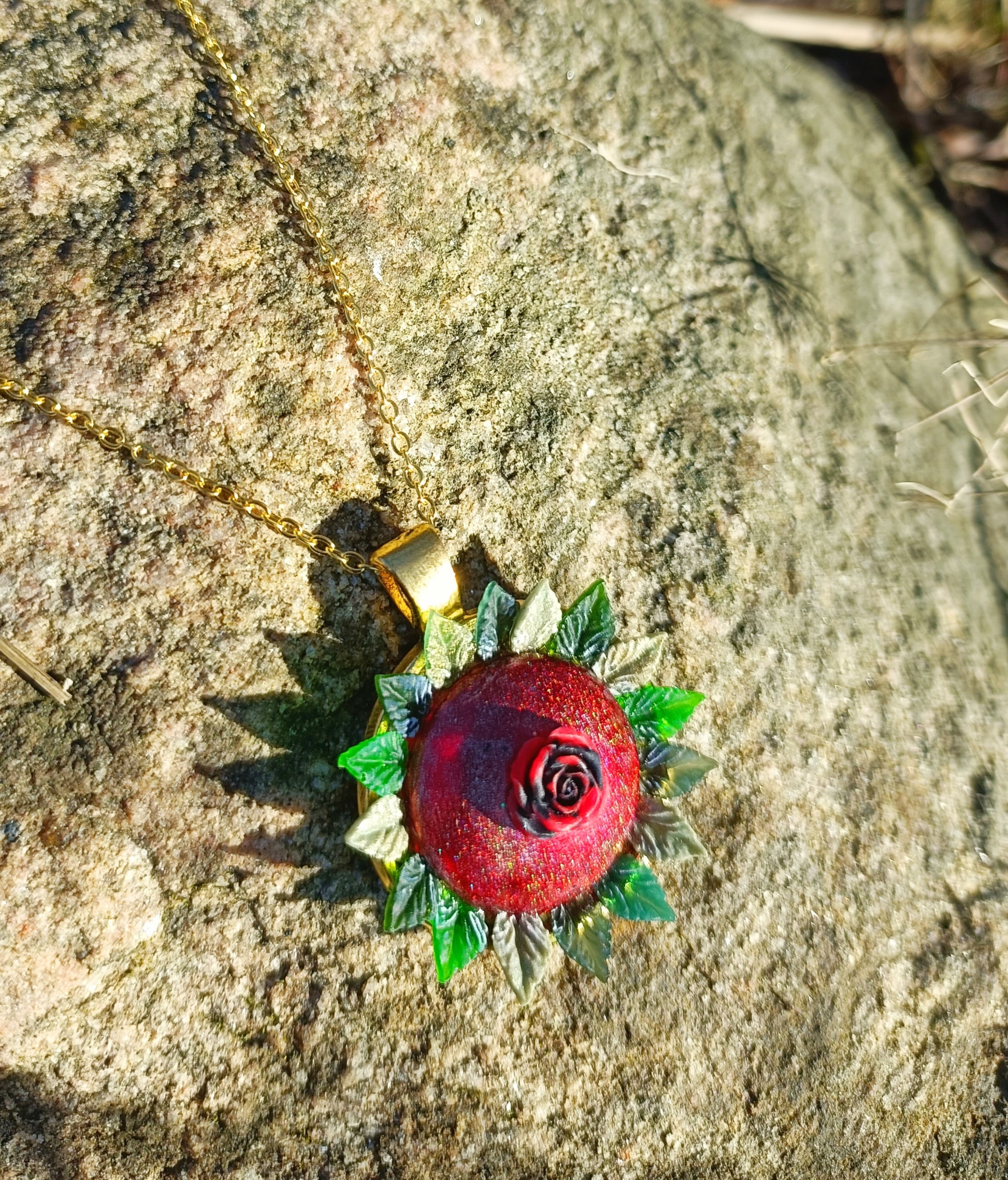 Step into nature’s elegance with the Rose & Leaf Crested Necklace, a beautifully crafted piece featuring a glass cabochon with shimmering varnish, intricate acrylic details, and a sturdy steel setting. This enchanting necklace is perfect for nature lovers, fae-inspired fashion, and those who appreciate delicate, botanical jewelry.