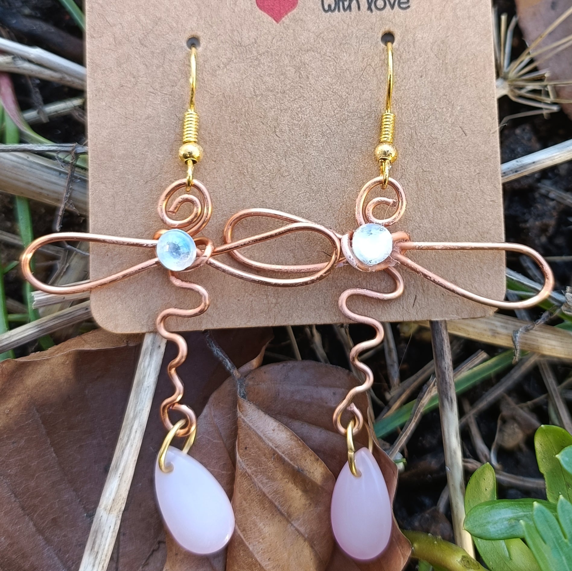 Delicate yet captivating, these Rosegold Dragonfly Earrings embody grace, transformation, and nature’s beauty. Handcrafted with intricate rose gold-colored wire, each earring features an elegant dragonfly design, symbolizing change, strength, and harmony. A shimmering glass drop dangles below, adding a touch of ethereal charm and movement.
