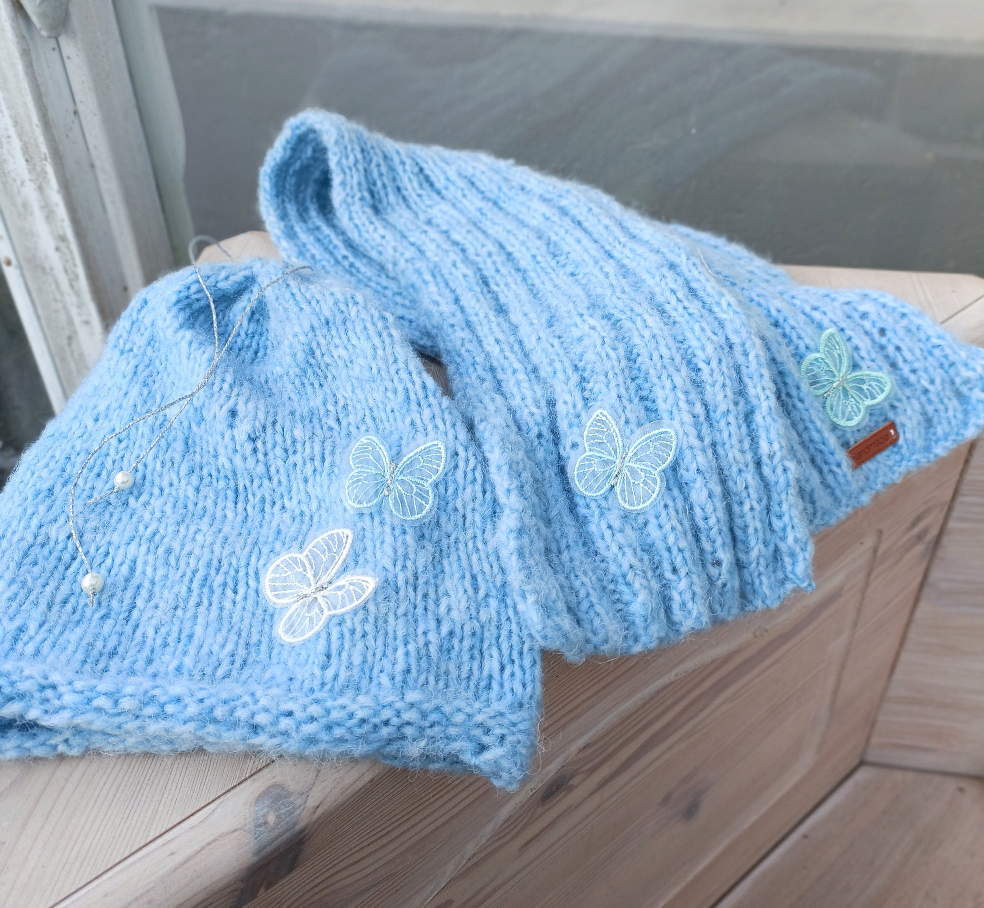 Elevate your winter wardrobe with the dreamy charm of our Sky Butterfly Beanie & Scarf Set. Hand-knitted from 100% alpaca wool, this exquisite set combines luxurious softness with timeless elegance. Delicate butterfly embroidery adds a whimsical touch, making this set as unique as it is cozy.