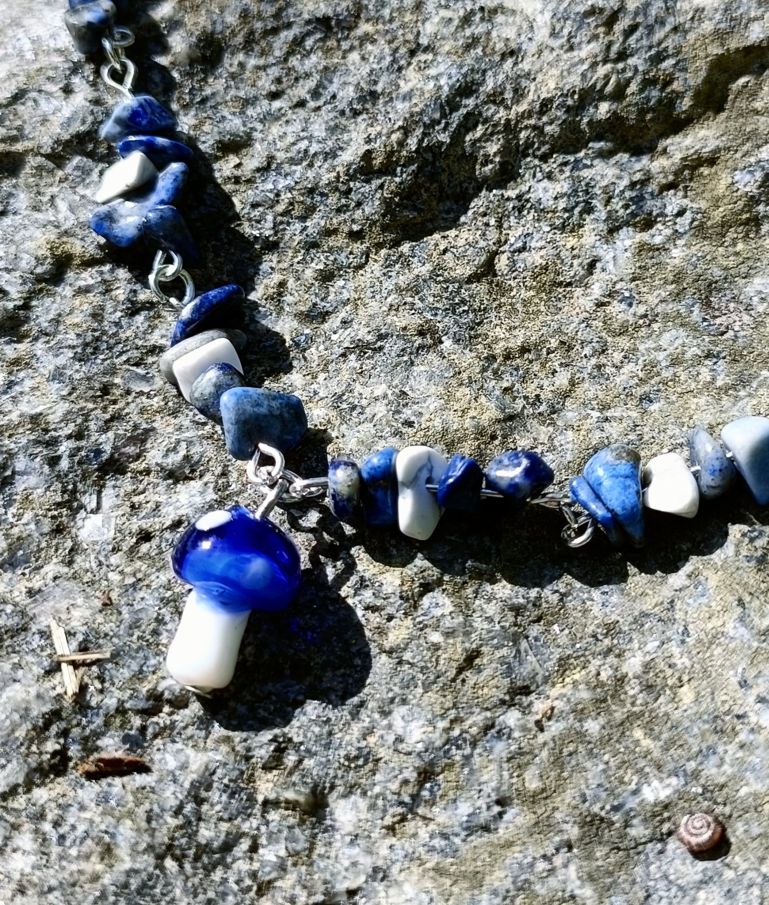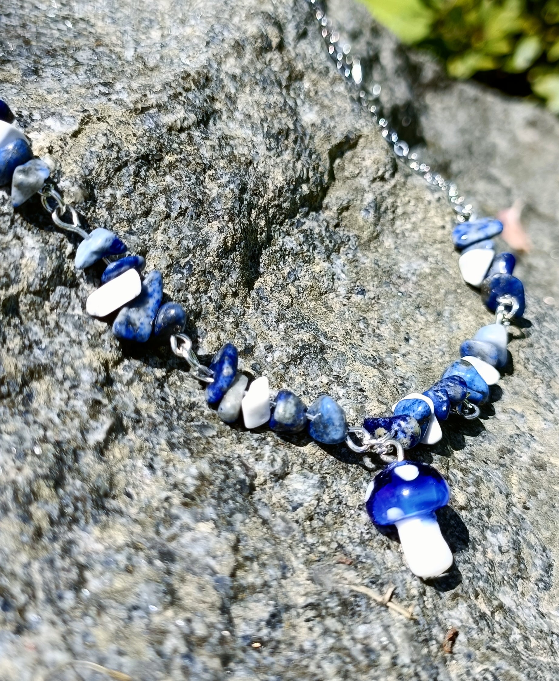 Embrace the calming energy of sodalite paired with whimsical charm in this delicate Sodalite Mushroom Necklace. Featuring genuine sodalite beads and a handcrafted glass mushroom pendant, this necklace combines natural beauty with playful elegance.