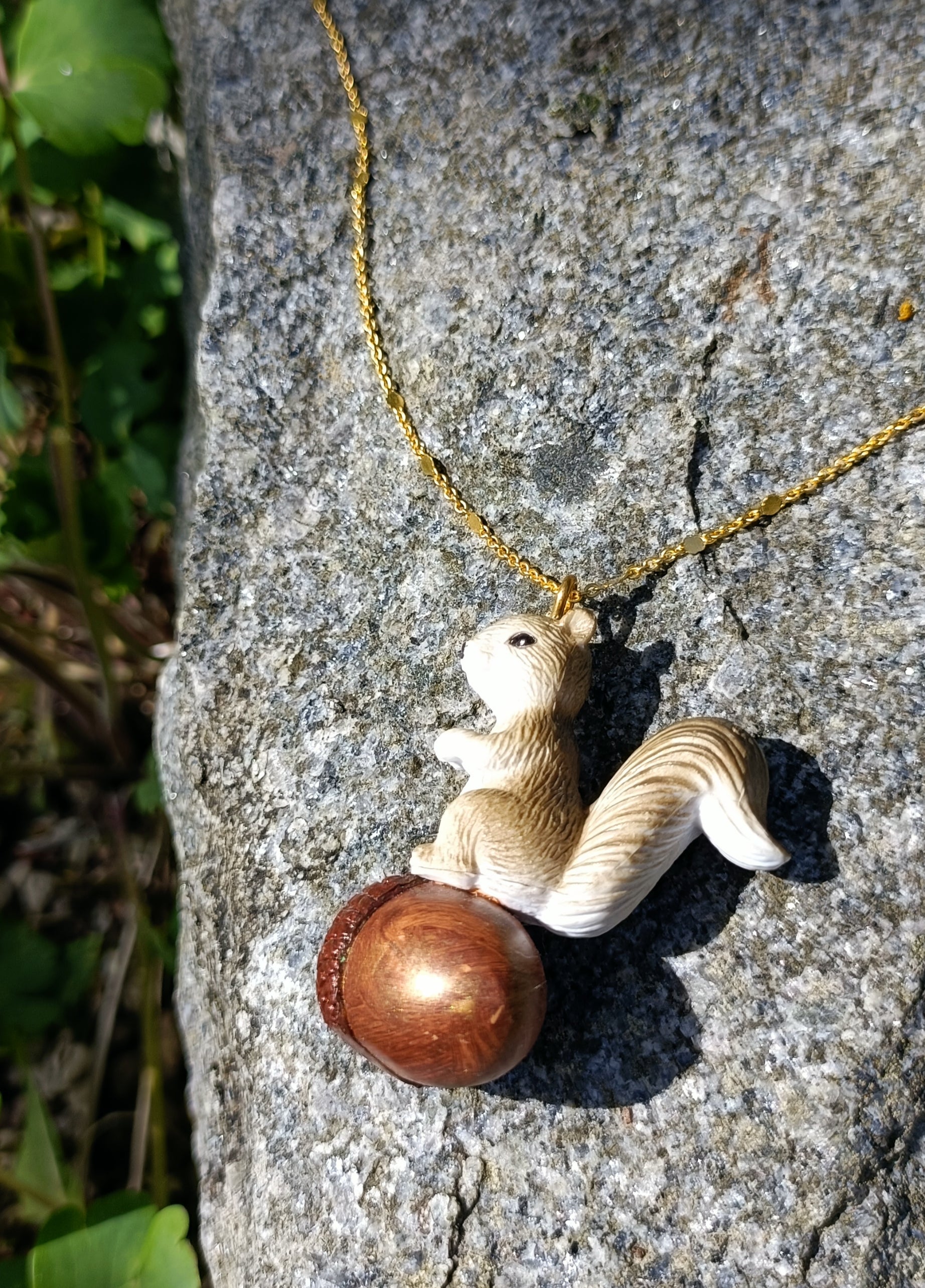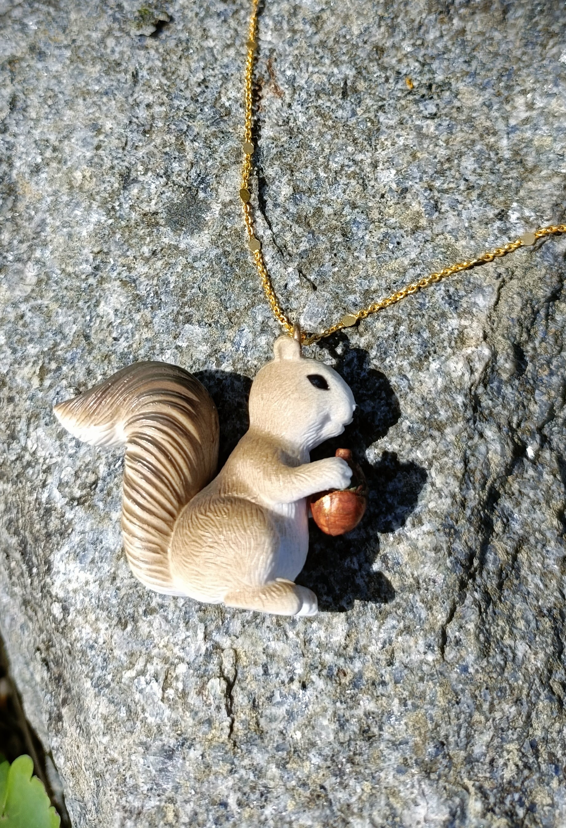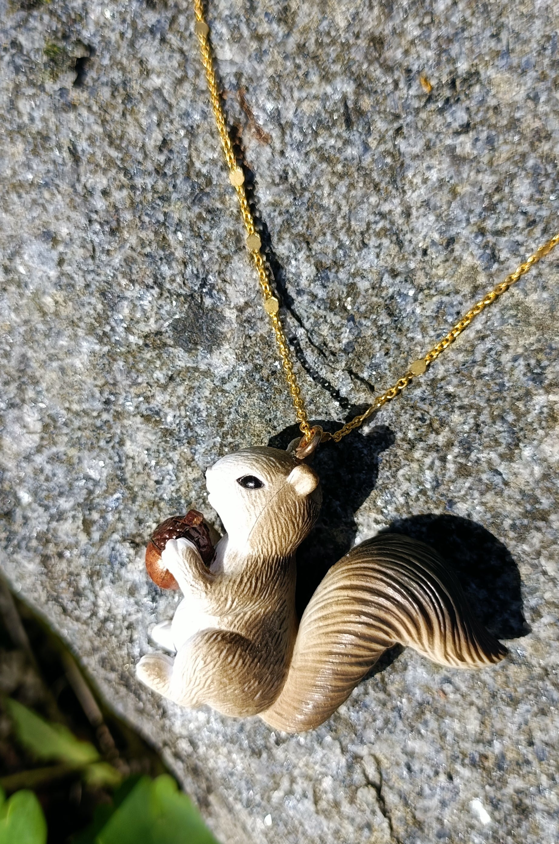 Bring a touch of woodland charm to your look with this handcrafted Squirrel & Acorn Pendant. Featuring a resin-cast design that’s been carefully hand-painted for detail and warmth, this pendant captures a playful squirrel alongside an acorn in delightful detail. Suspended on a golden chain, it’s a sweet and subtle tribute to forest life—perfect for nature lovers and fans of rustic, whimsical style.