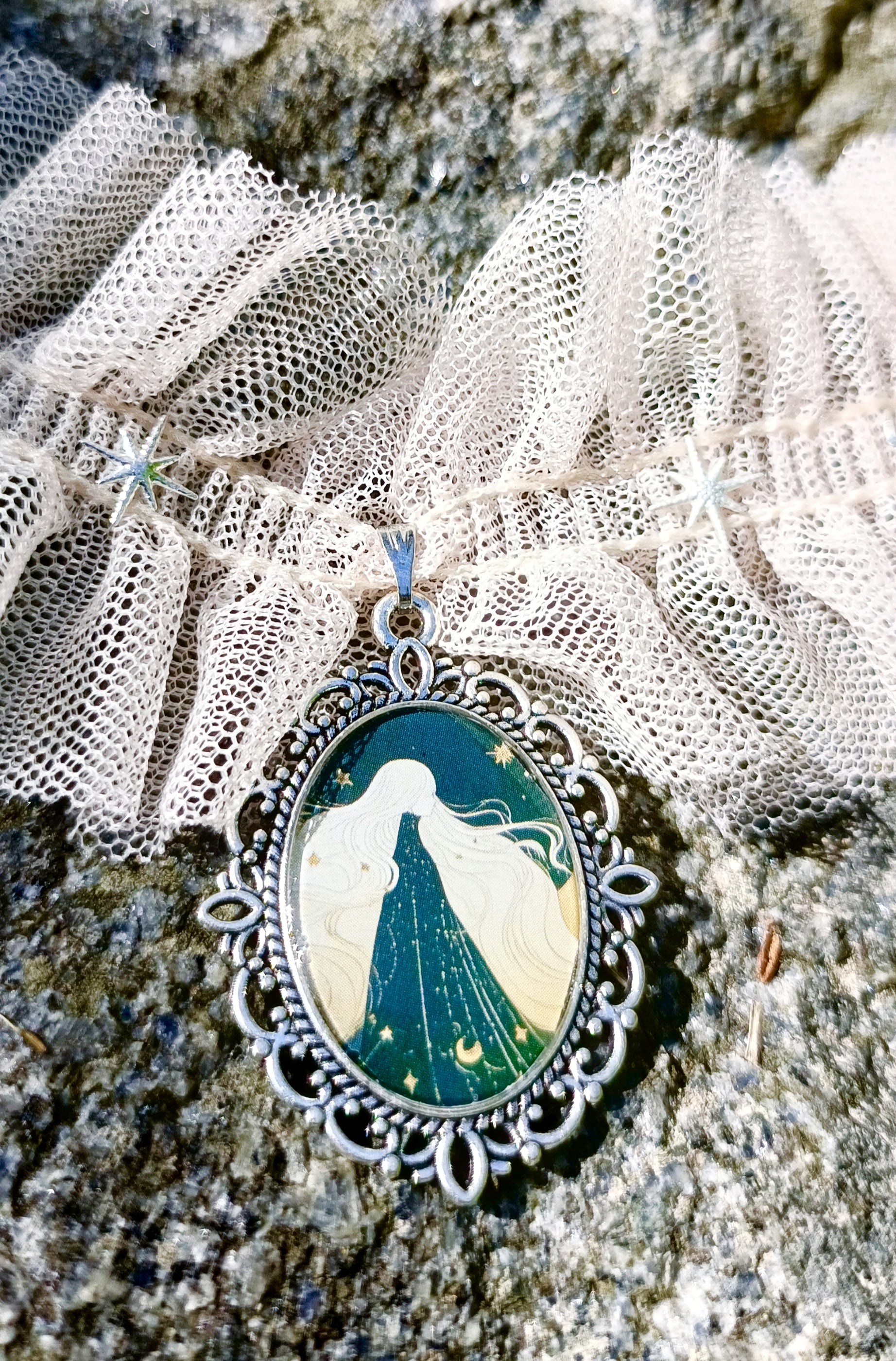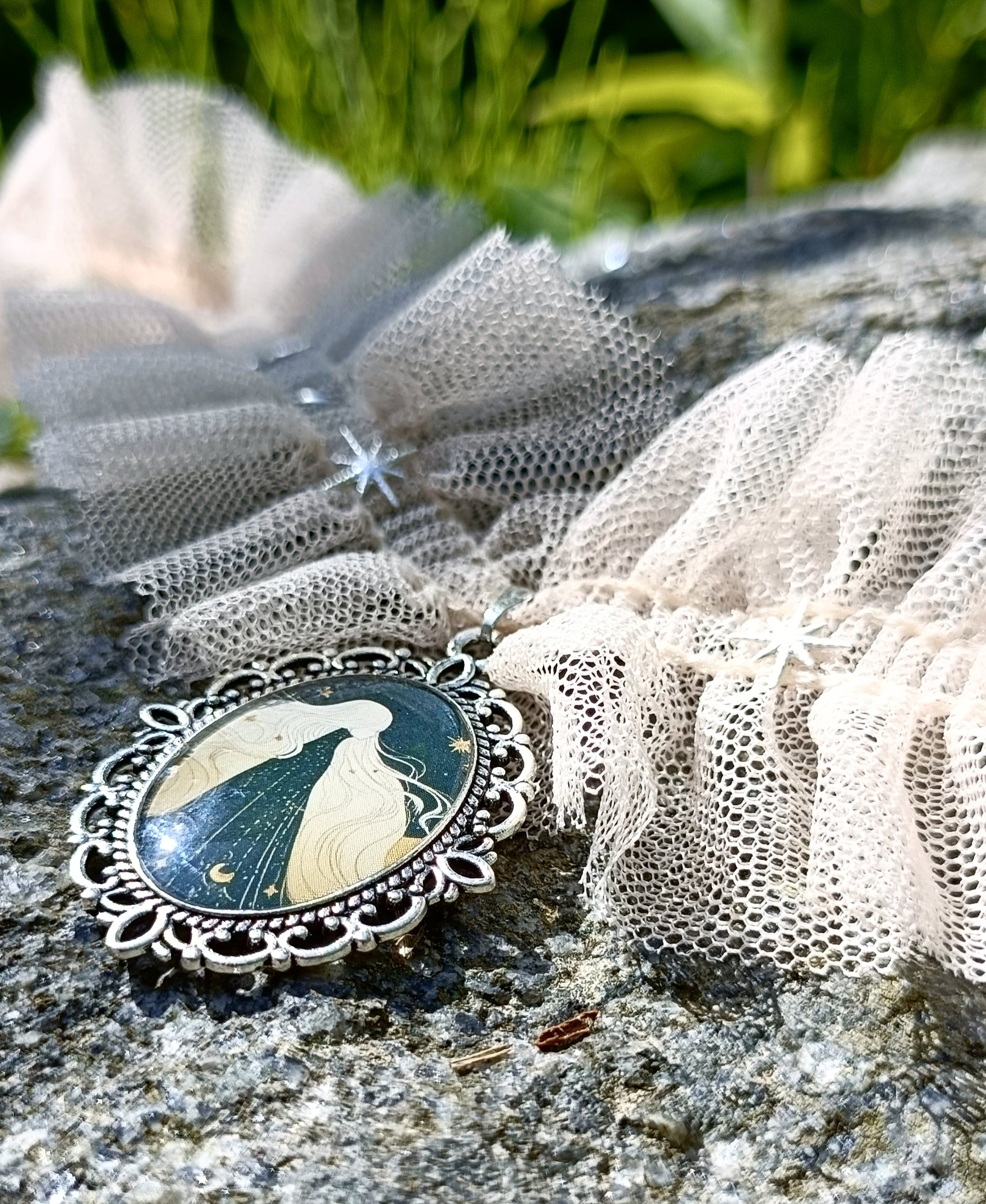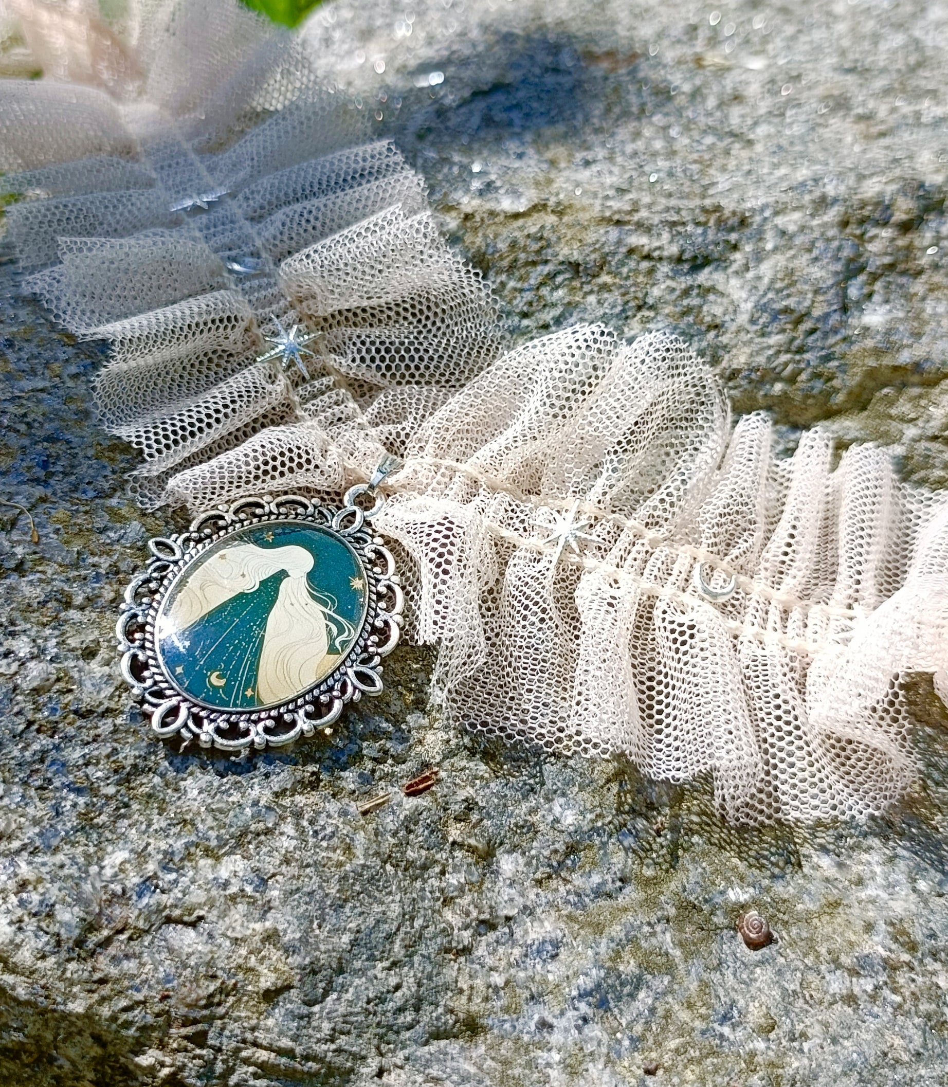 Channel cosmic beauty and divine energy with the Star Goddess Choker — a delicate and radiant piece crafted to honor celestial femininity. This choker features a soft, breathable tulle band, adorned with acrylic and aluminum star-themed ornaments, and centered around a detailed steel cabochon showcasing a Star Goddess print sealed beneath a dome of clear resin for a glass-like finish.