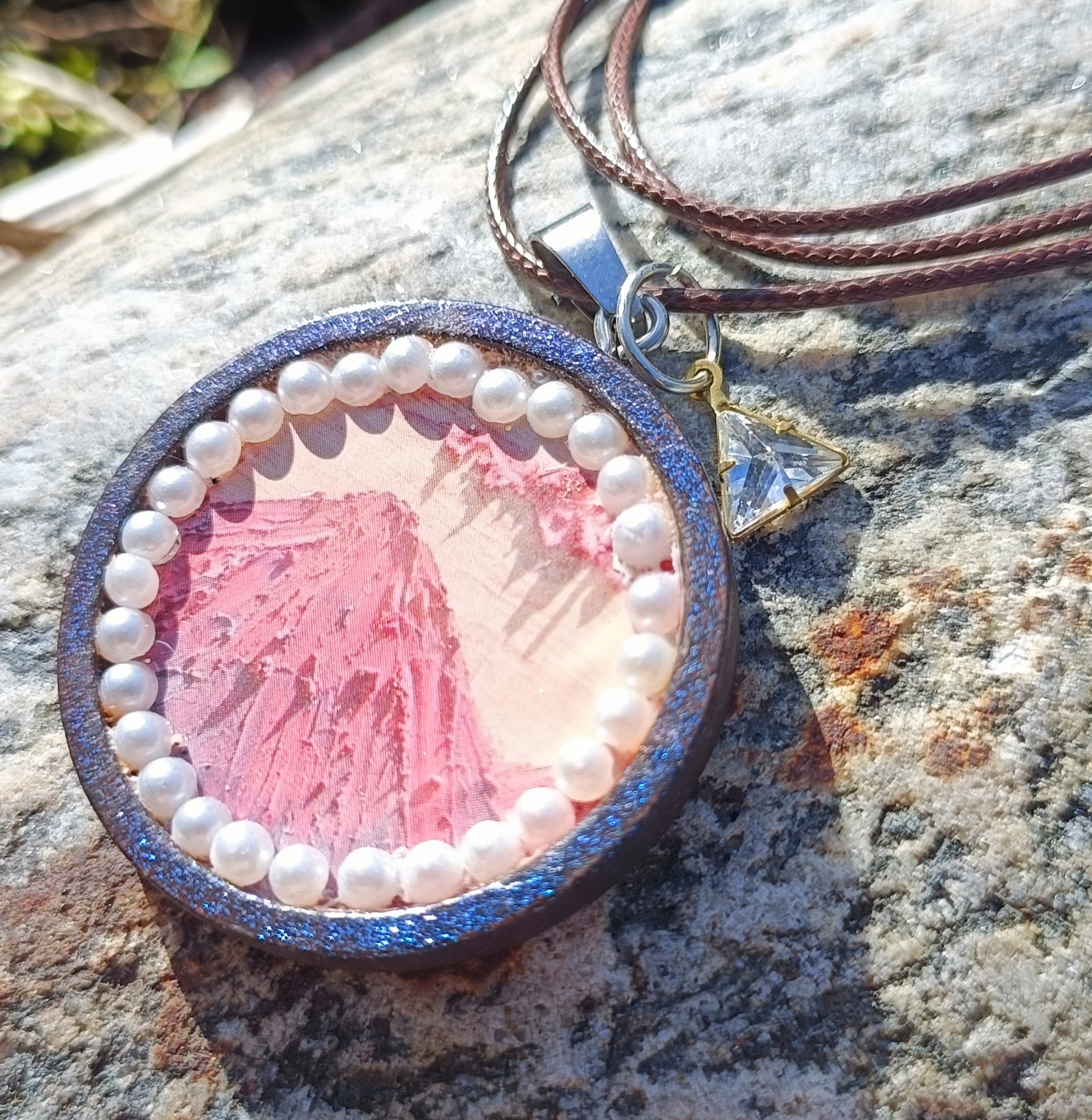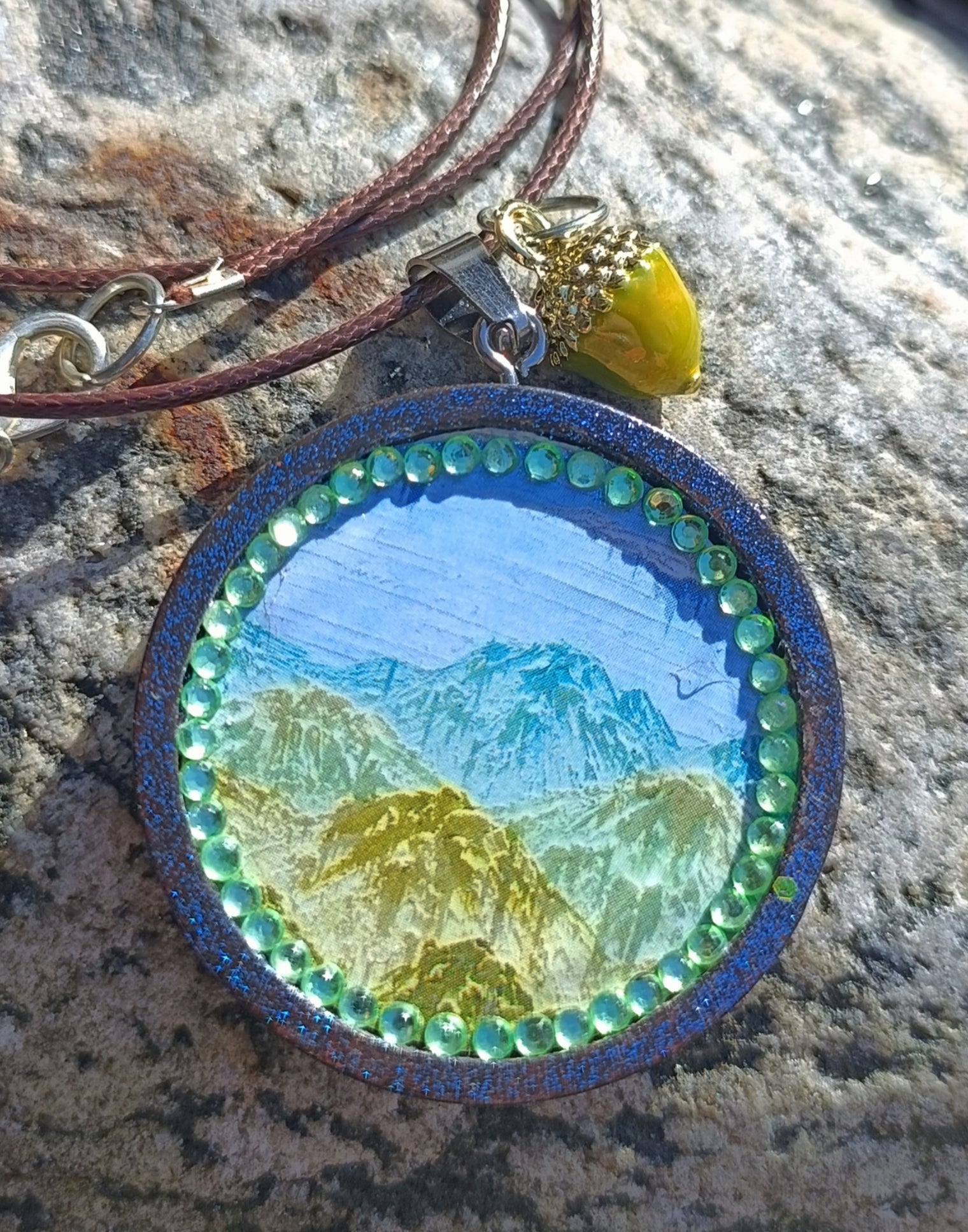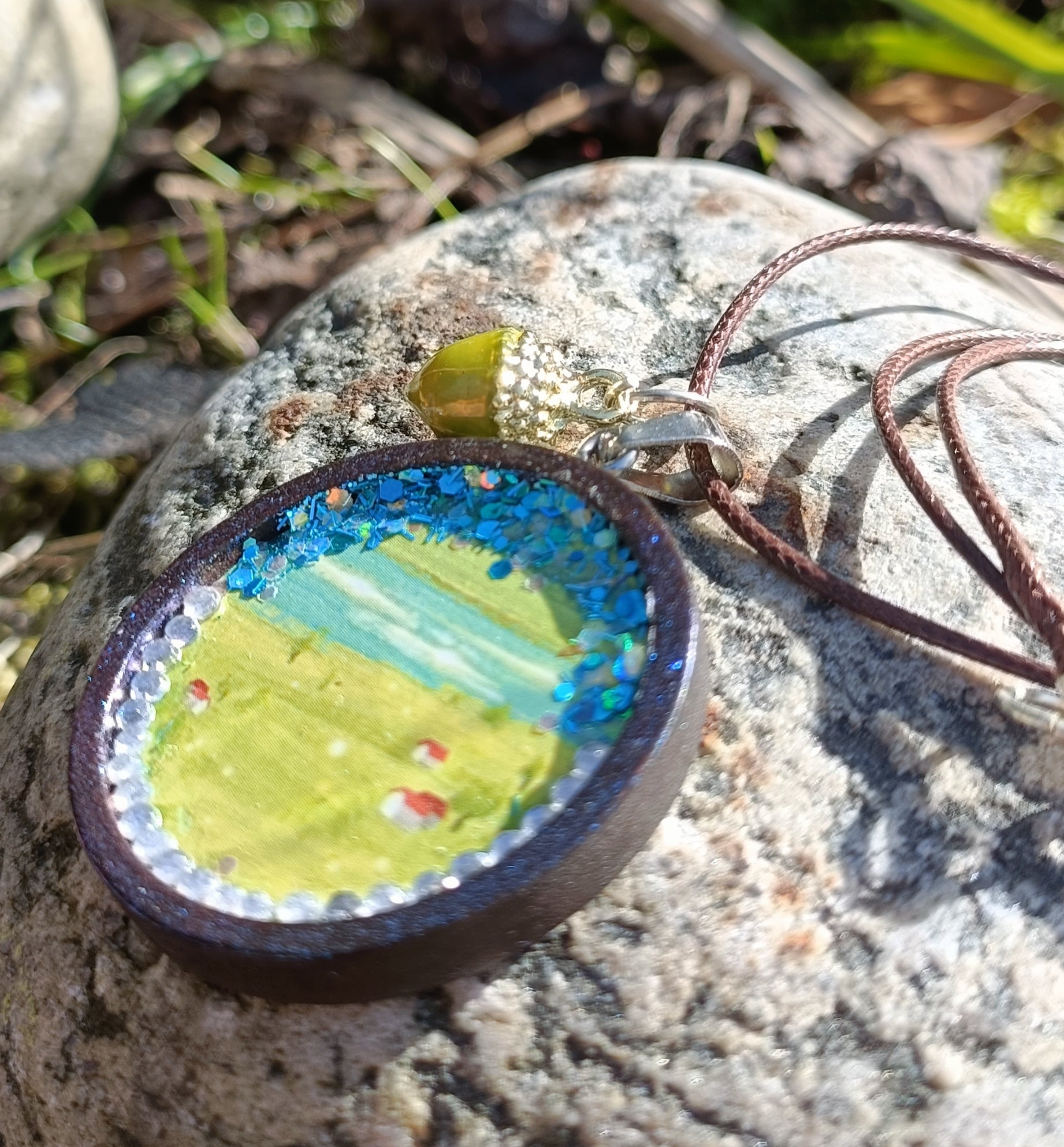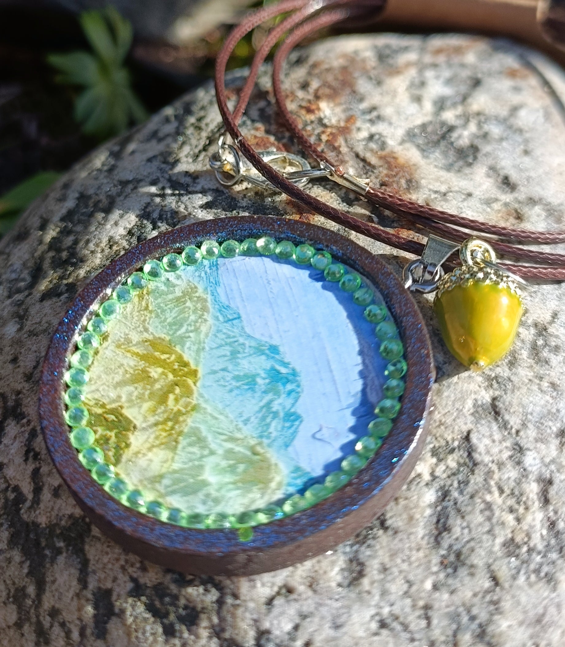 The Tiny Painting Necklace is a stunning, artistic accessory that brings a miniature masterpiece to life. This unique necklace features a stained beech cabochon, showcasing a printed design that captures intricate details in a small, beautiful scene or pattern. The cabochon is adorned with rhinestones, adding a touch of sparkle and elegance.