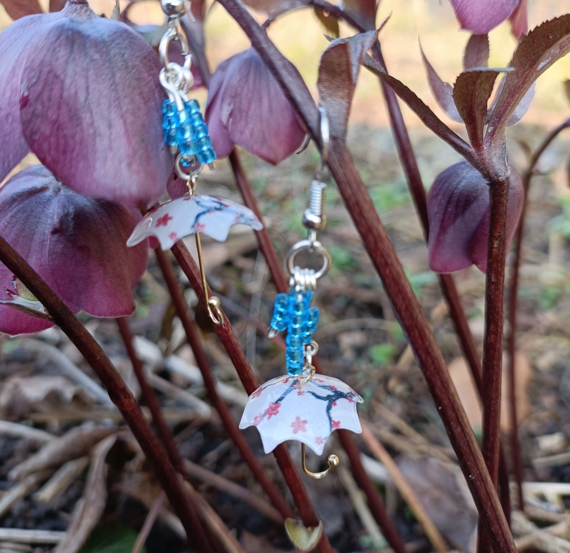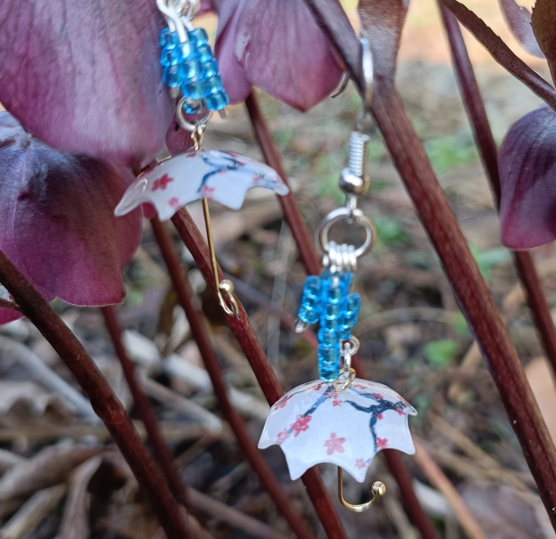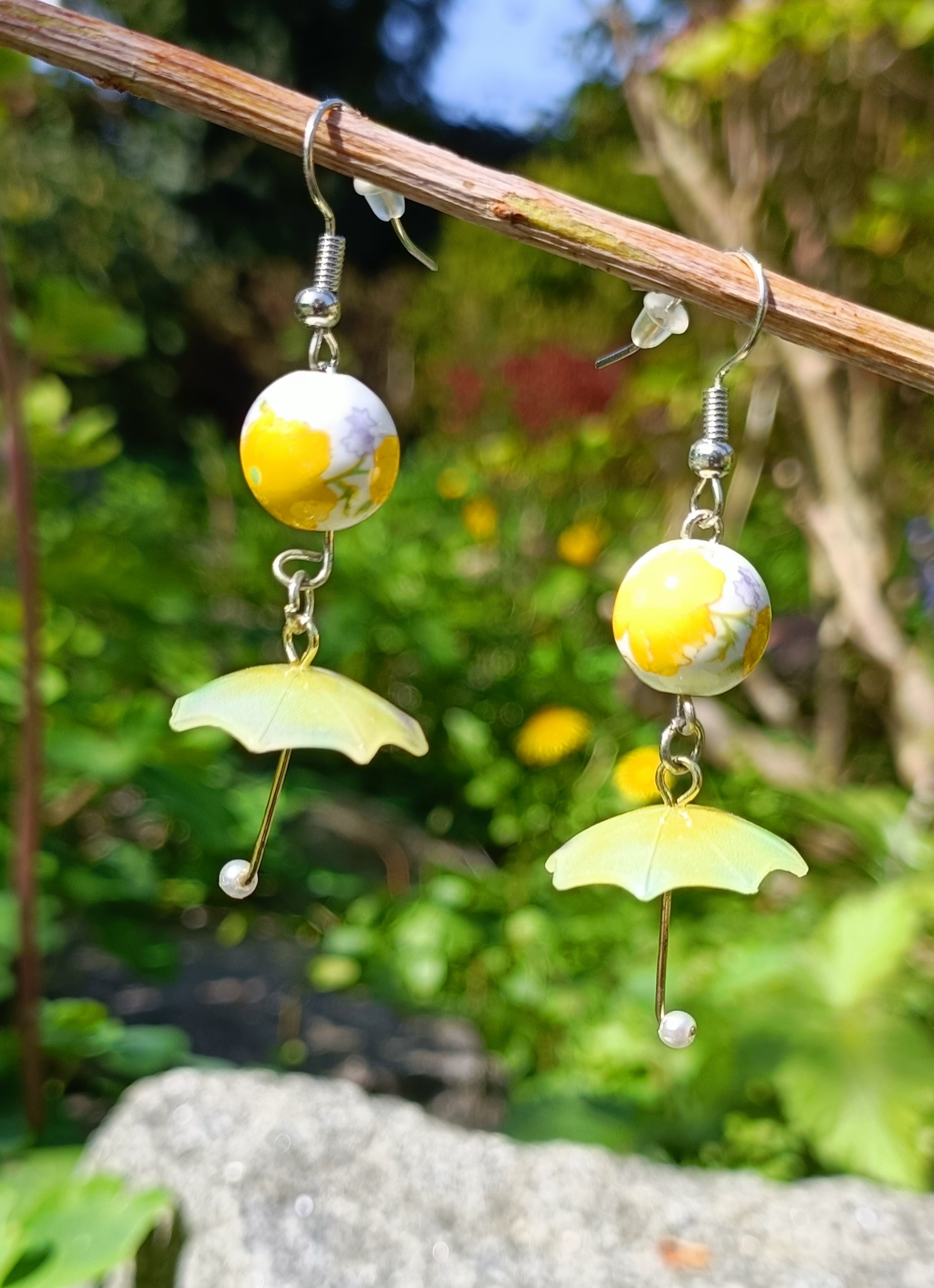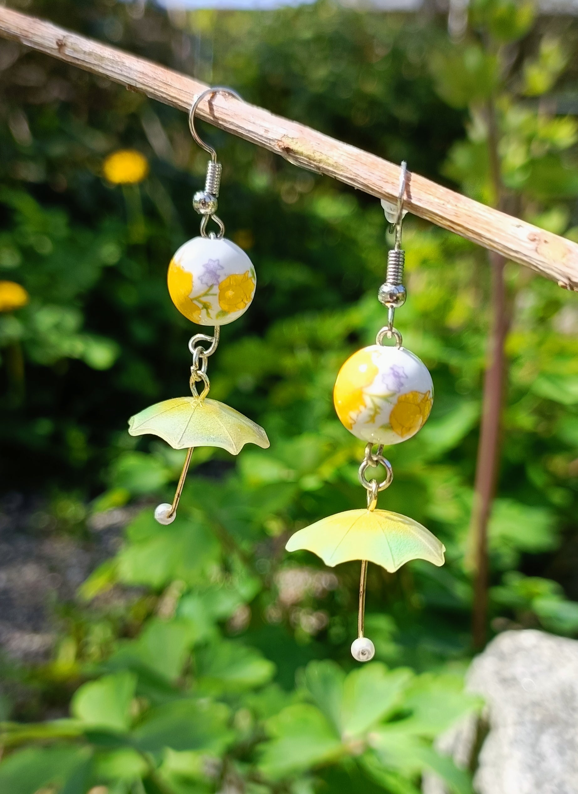 Playful and artistic, these handmade umbrella earrings feature delicately shaped acrylic umbrellas paired with a whimsical mix of glass and porcelain beads. Each piece is thoughtfully assembled to create a unique accessory that’s full of personality and movement. Lightweight yet eye-catching, these earrings are perfect for adding a fun twist to any outfit.